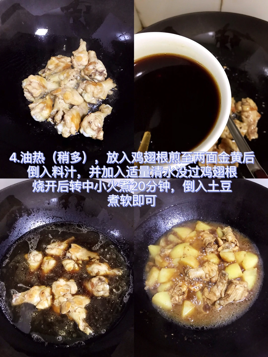 3⃣️油热(稍多)、放入鸡翅根煎至两面金黄,倒入料汁,并加入适量清水没过鸡翅根,烧开后转中小火煮20分钟,倒入土豆煮软即可