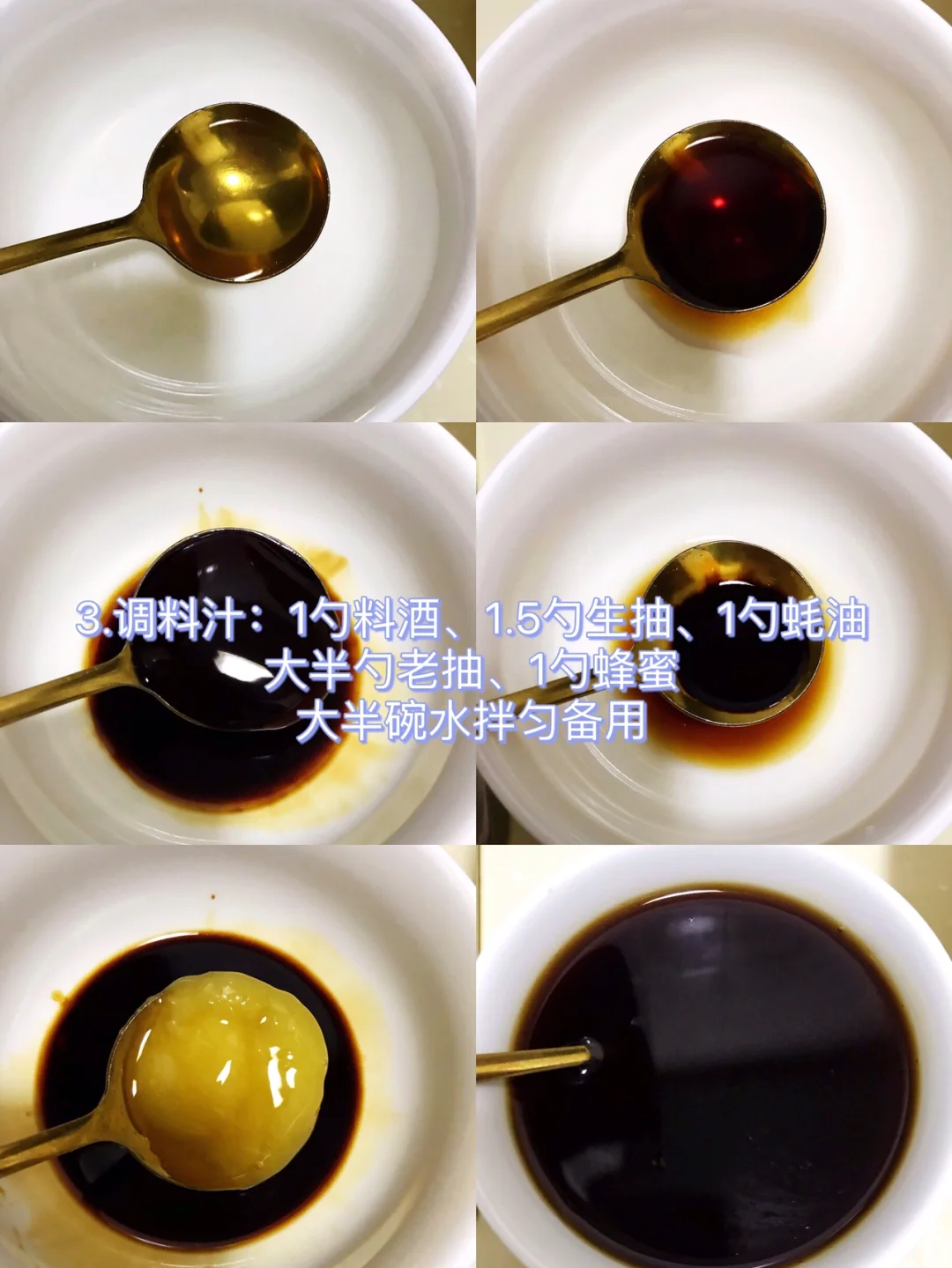 2⃣️调料汁:1勺料酒、1.5勺生抽、1勺蚝油、大半勺老抽、1勺蜂蜜、大半碗水拌匀备用