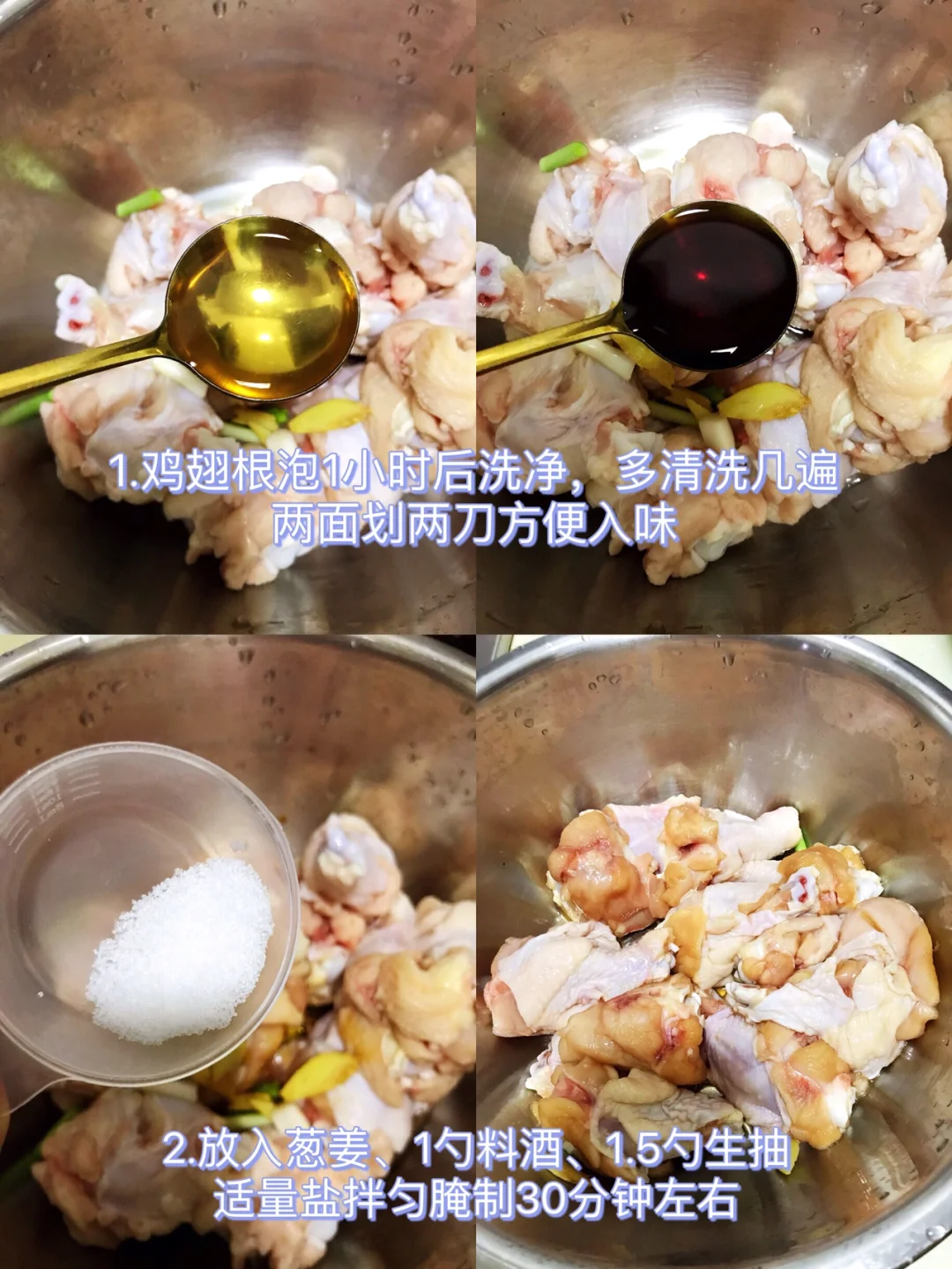 1⃣️鸡翅根泡1小时后洗净,多清洗几遍,两面划上几刀方便入味;再放入葱姜、1勺料酒、1.5勺生抽、适量盐(5g)、拌匀腌制30分钟左右