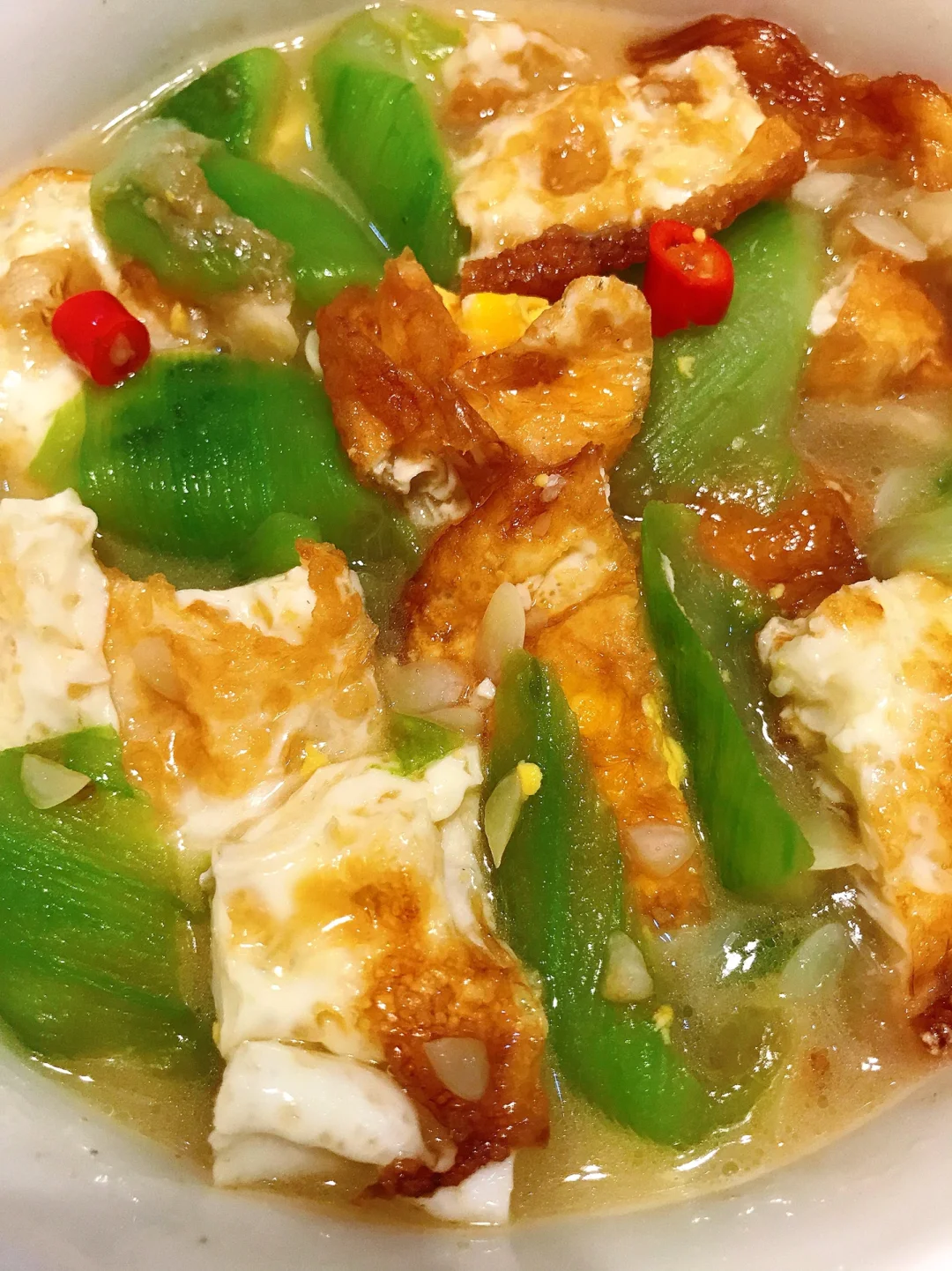 [赞R]今天分享一款丝瓜焖荷包蛋!好吃下饭,清爽解腻,很适合夏天哦!喜欢的赶紧试试吧! [赞R]食材:丝瓜(1根)、鸡蛋4个、蒜、小米辣(可不放) [赞R]做法: 1⃣️丝瓜削皮洗净切成滚刀块、小米辣、蒜切好备用 2⃣️油热,打入鸡蛋煎成荷包蛋盛出切成小块备用 3⃣️另起锅油热,放入蒜炒香,倒入丝瓜、适量生抽翻炒一下 4⃣️加入适量清水、倒入荷包蛋,再放入适量盐、胡椒粉、小米辣焖2分钟即可
