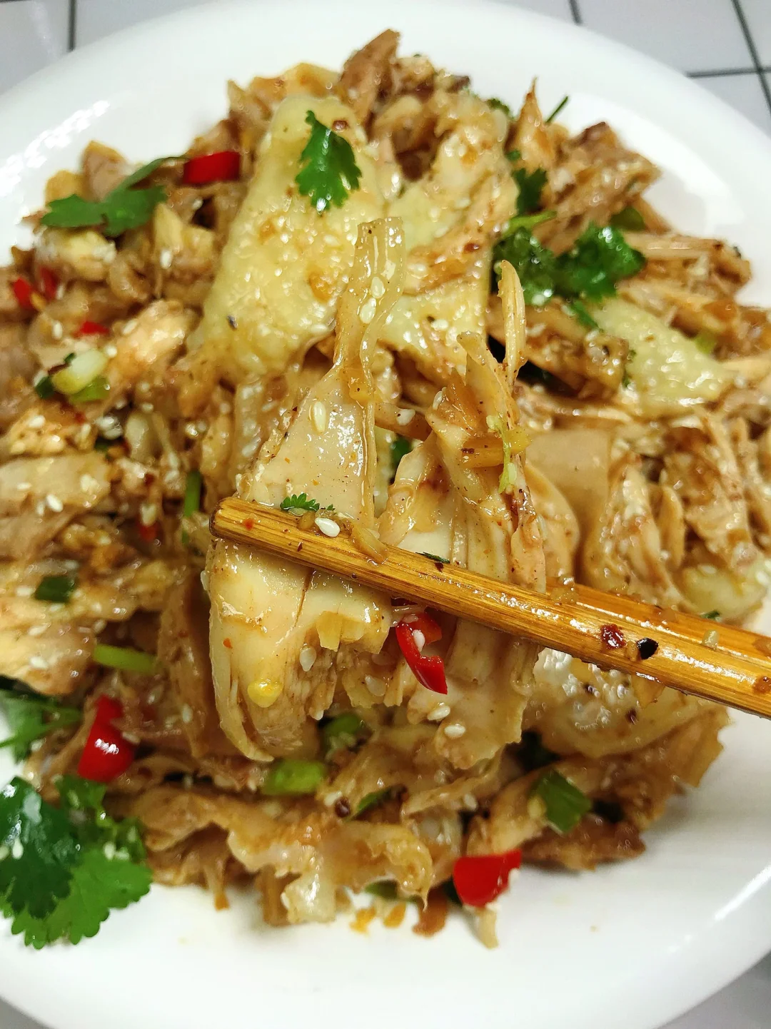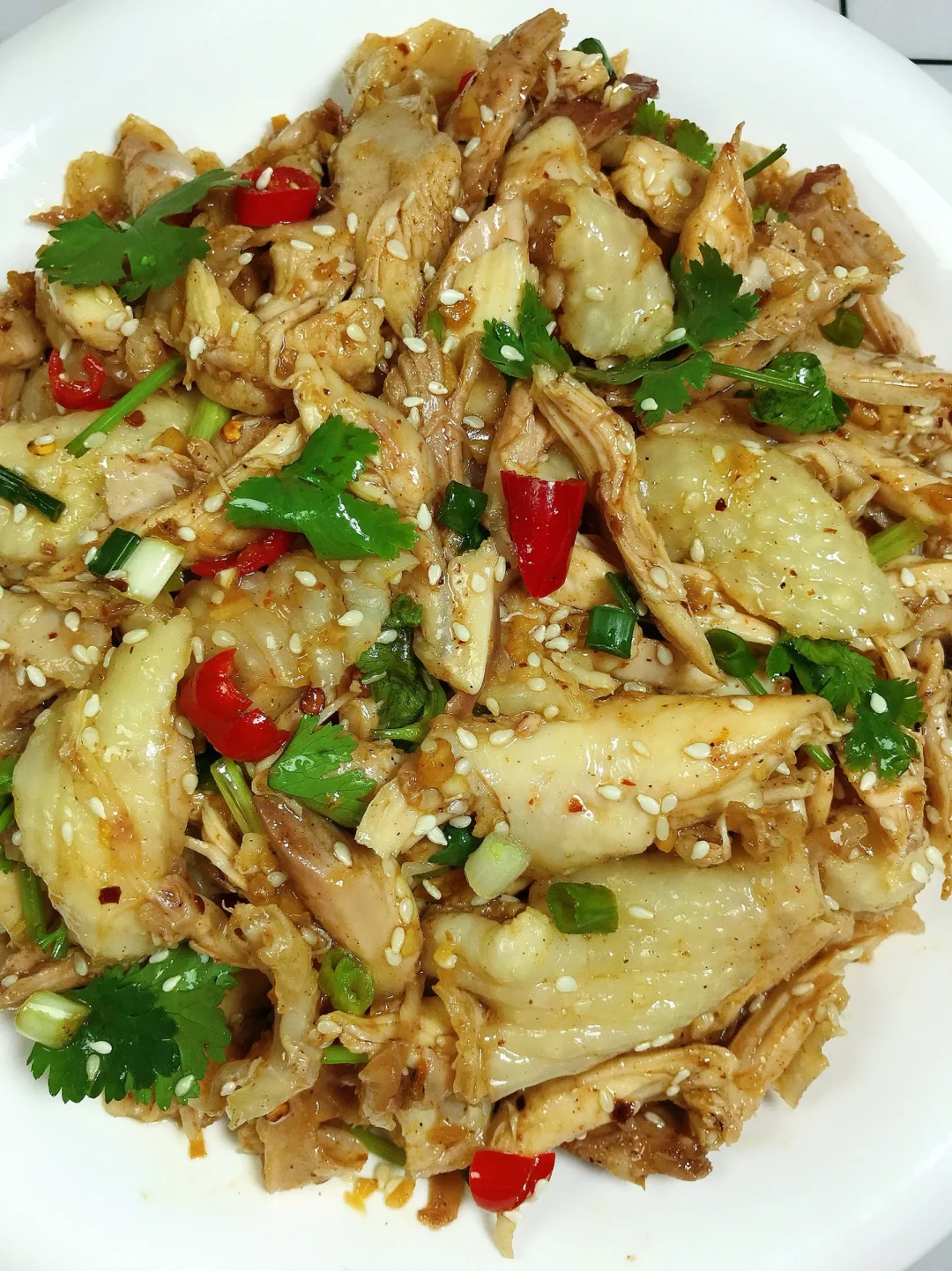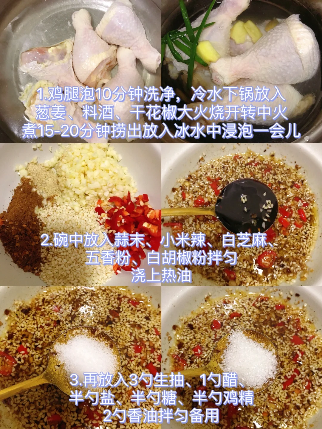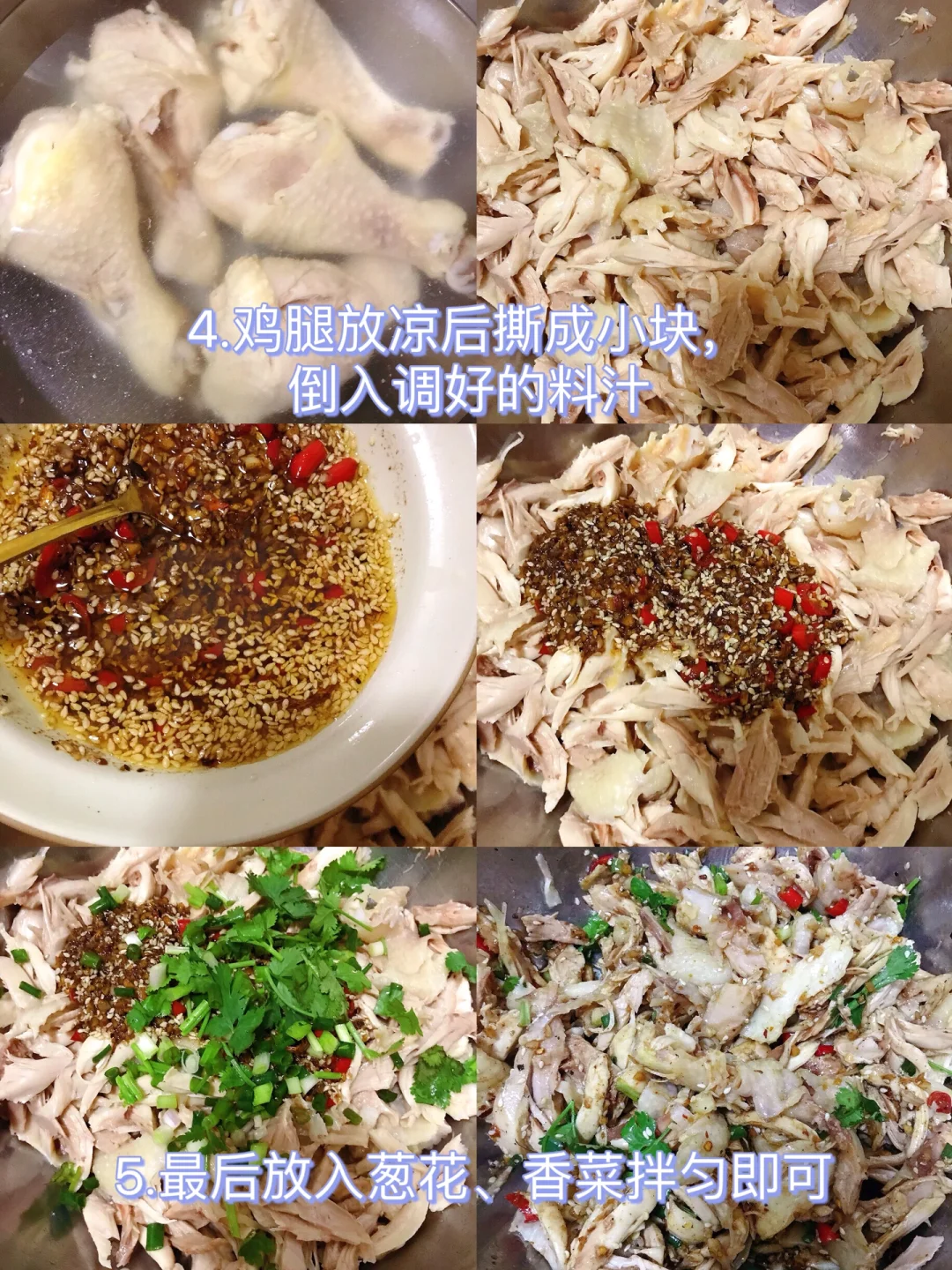 [赞R]今天分享一款手撕鸡腿!好吃入味,清爽解腻!喜欢的赶紧试试吧! [赞R]食材:鸡腿、小米辣、蒜末、白芝麻、葱姜、葱花、香菜、五香粉 [赞R]做法: 1⃣️鸡腿泡10分钟洗净,冷水下锅放入葱姜、料酒、干花椒大火烧开转中火煮15-20分钟捞出放入冰水中浸泡一会儿 2⃣️碗中放入蒜末、小米辣、白芝麻;五香粉、白胡椒粉拌匀浇上热油,再放入3勺生抽、1勺醋、半勺盐、半勺糖、半勺鸡精、2勺香油拌匀备用 3⃣️鸡腿放凉后撕成小块,倒入调好的料汁,最后放入葱花、香菜拌匀即可