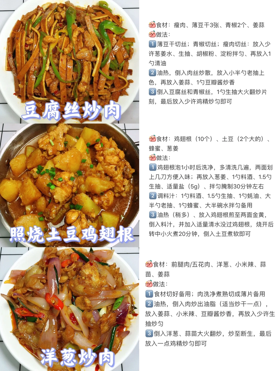 [赞R]今天给大家整理了六款超级好吃的家常菜合集!每天不知道吃什么的小伙伴可以参考一下这个食谱哦!每天不重样! [赞R]每一款都有详细的教程哦!翻看图片就能看见! 1⃣️芋儿鸡 2⃣️胡萝卜回锅肉 3⃣️泡椒鱼 4⃣️豆腐丝炒肉 5⃣️照烧土豆鸡翅根 6⃣️洋葱炒肉