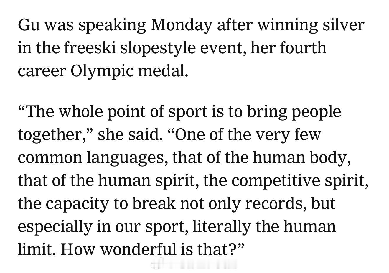 谷爱凌表示,令她感到失望的是,围绕奥运会的最新舆论焦点竟然是川普的言论,而不是体育本该具有的团结世界的力量。