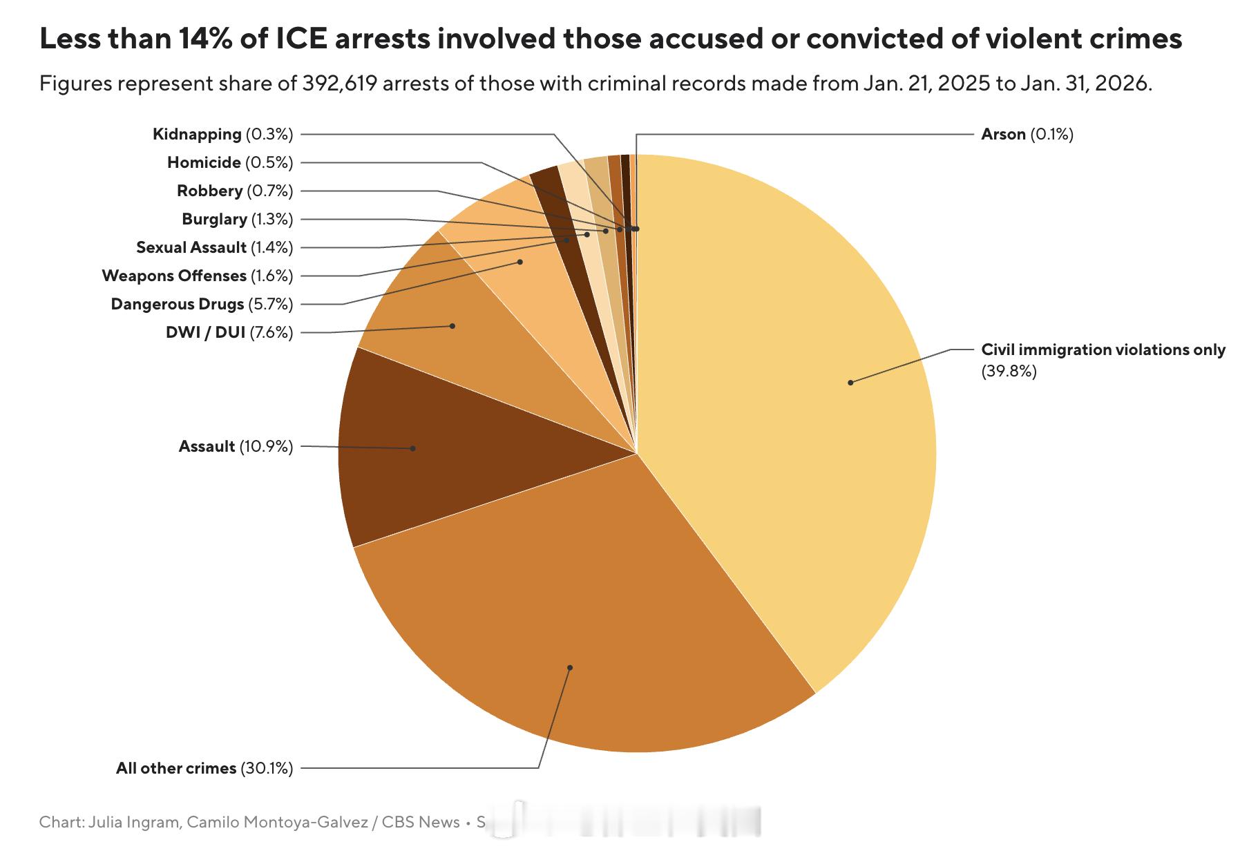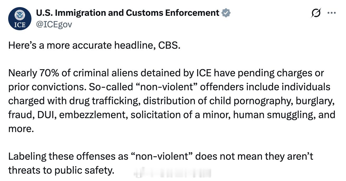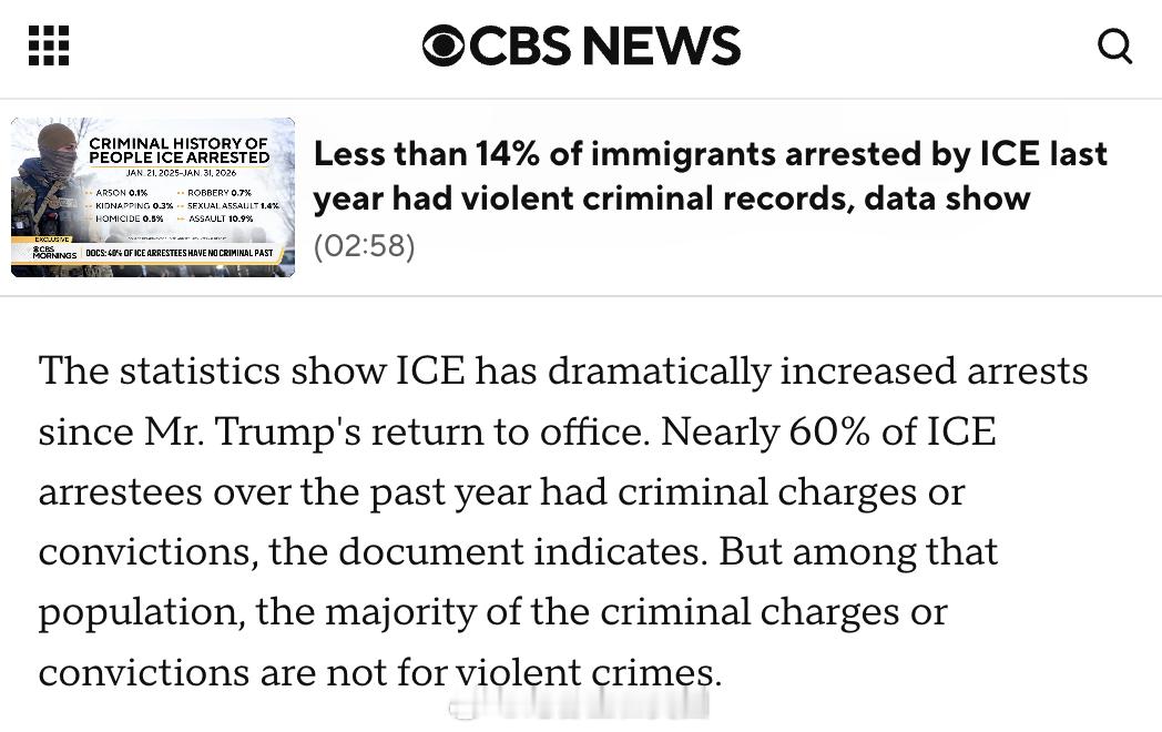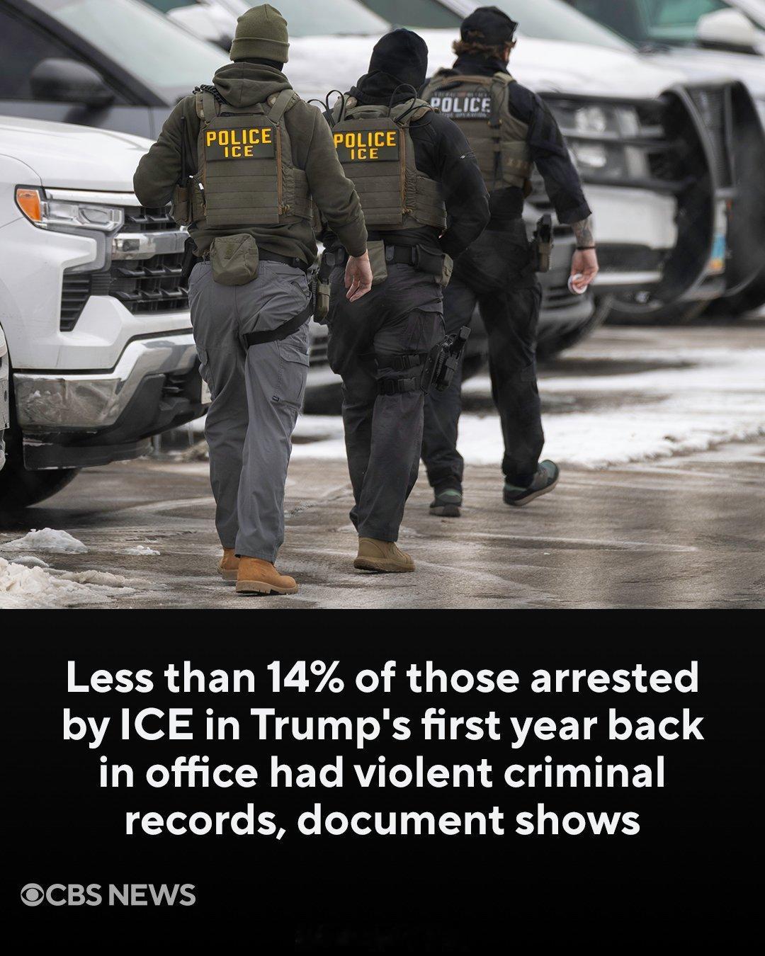 CBS News今天发文并配图,重点想强调的是:在过去一年里,ICE逮捕的近40万名移民中(标题和文字用的是“移民”,而没有用“非法移民),被指控或曾因暴力犯罪被定罪的还不到 14%。