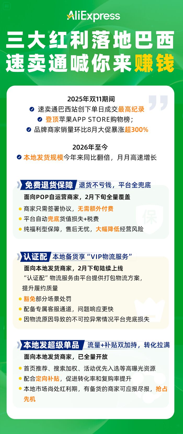 一是免费退货保障。针对针对巴西退货成本相对较高的痛点,速卖通为跨境POP自运营商家推出“免费退货保障”服务:商家只需签署协议,无需额外付费,平台便会自动覆盖退货产生的货值损失+税费。目前,速卖通巴西退货保障目前已分批上线,预计2月下旬全面覆盖。