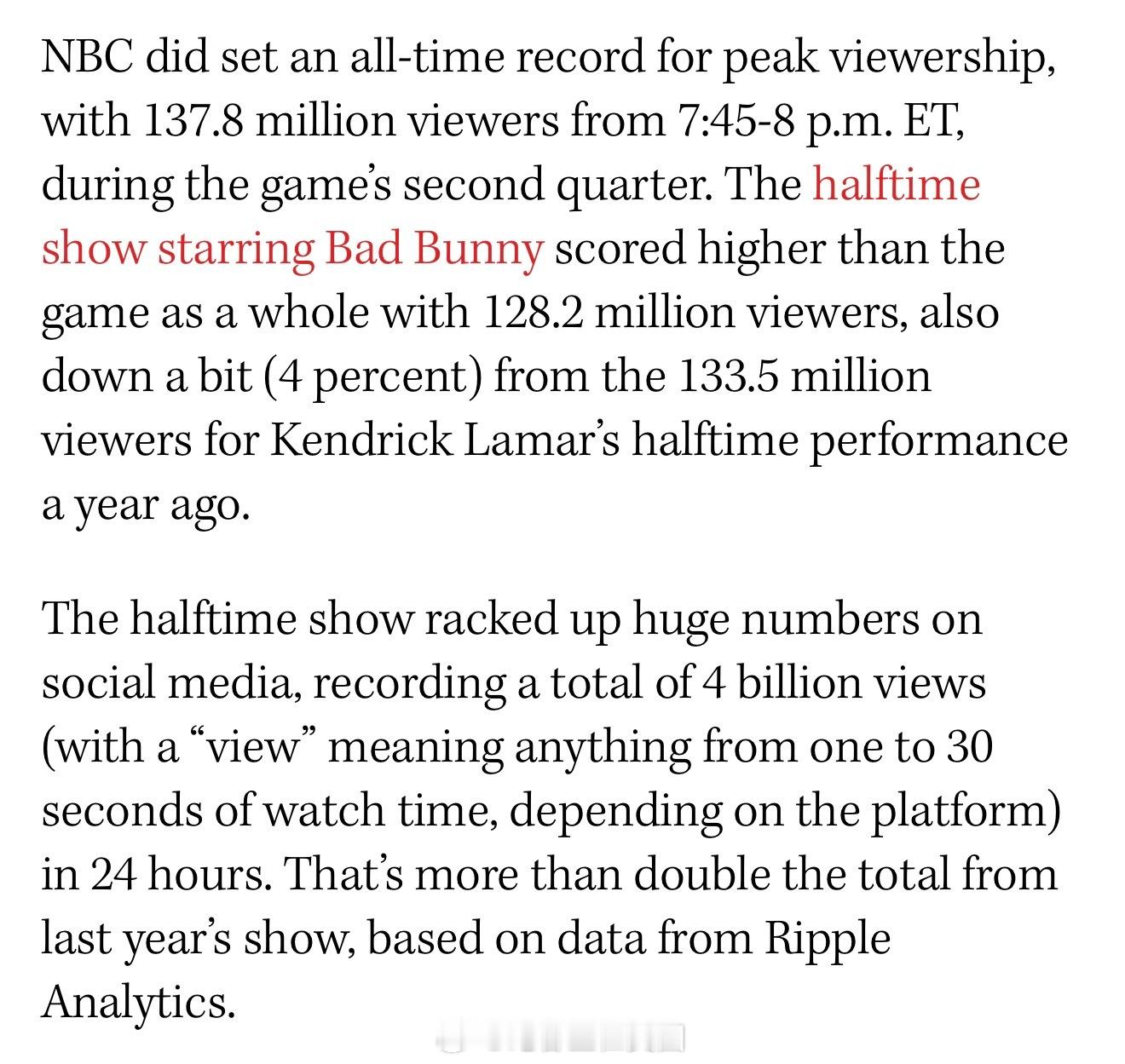 今年Bad Bunny的超级碗中场秀总收视率:1.28亿,低于去年同样也是听不懂在唱什么的喇嘛,喇嘛去年超级碗中场秀收视率为史高的1.33亿。