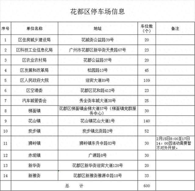 2026年春节期间,花都区部分党政机关面向社会免费开放单位停车场。开放时间:2026年2月15日至2月23日(每日8:00—20:00,如有变化,以各停车场现场通知为准)。开放范围:区人民政府大院、区发展和改革局、新华街道办事处、花山镇人民政府等14家单位共计600个泊位,具体开放点位信息可通过“花都智慧停车”微信小程序实时查询。