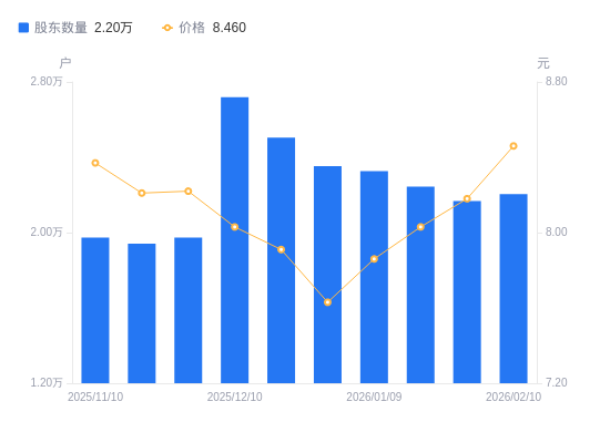 日期A股户数(户)流通A股户均持股数(股)户均持股市值(万元)2026-02-102204310515.388.902026-01-302167310694.908.752026-01-202243410332.118.302026-01-09232639963.917.832025-12-31235349849.177.512025-12-19250479254.227.322025-12-10271868526.106.852025-11-281974111741.589.652025-11-201941611938.129.802025-11-101974211740.989.83