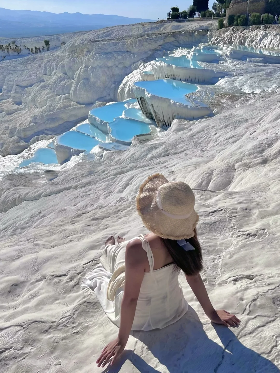 白色钙华台阶像凝固的瀑布,温泉水顺着阶梯流淌,奇观级别