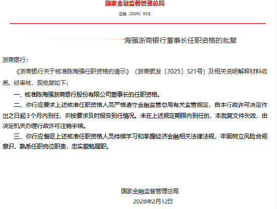 2月13日金融一线消息,国家金融监督管理总局今日发布《关于陈海强浙商银行董事长任职资格的批复》,核准陈海强浙商银行股份有限公司董事长的任职资格。