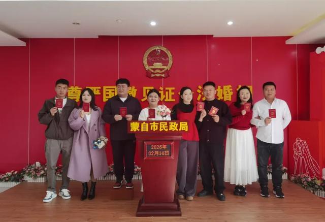 上午9时许,记者在蒙自市婚姻登记中心看到,大厅内欢声笑语,一对对新人手持鲜花,在工作人员引导下有序填表、领证。精心布置的颁证台前,新人们或相拥合影,或深情告白。