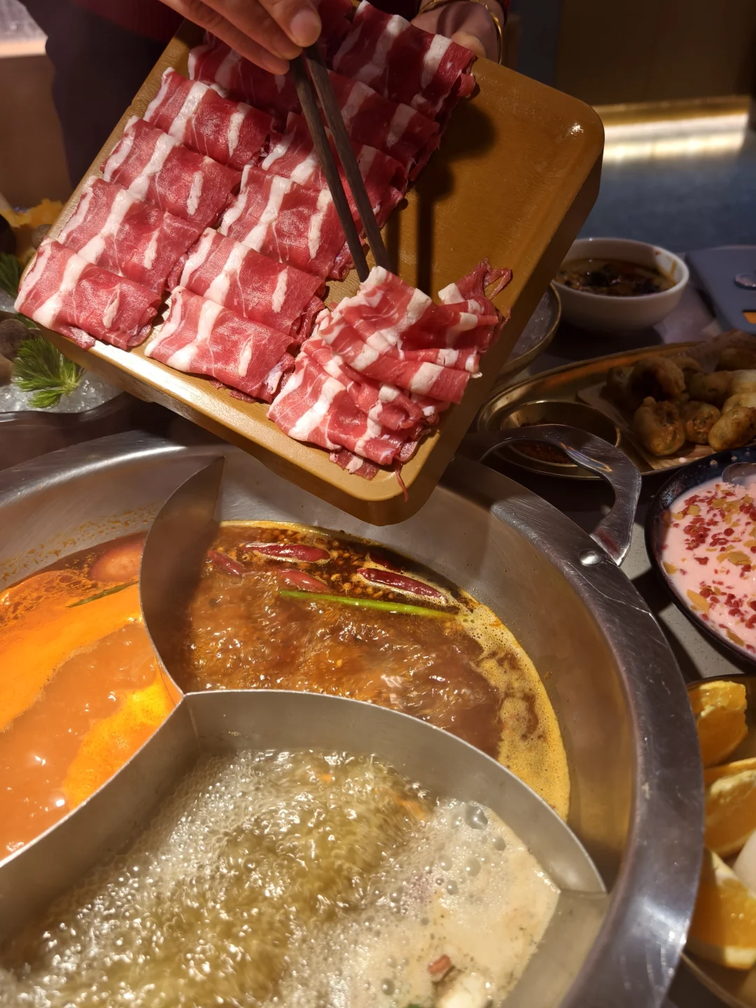 锅底选了「三味锅」,麻辣牛油锅香浓够味,菌汤锅清爽解腻,番茄🍅清甜浓郁,涮什么都绝配![色色R][色色R][色色R]