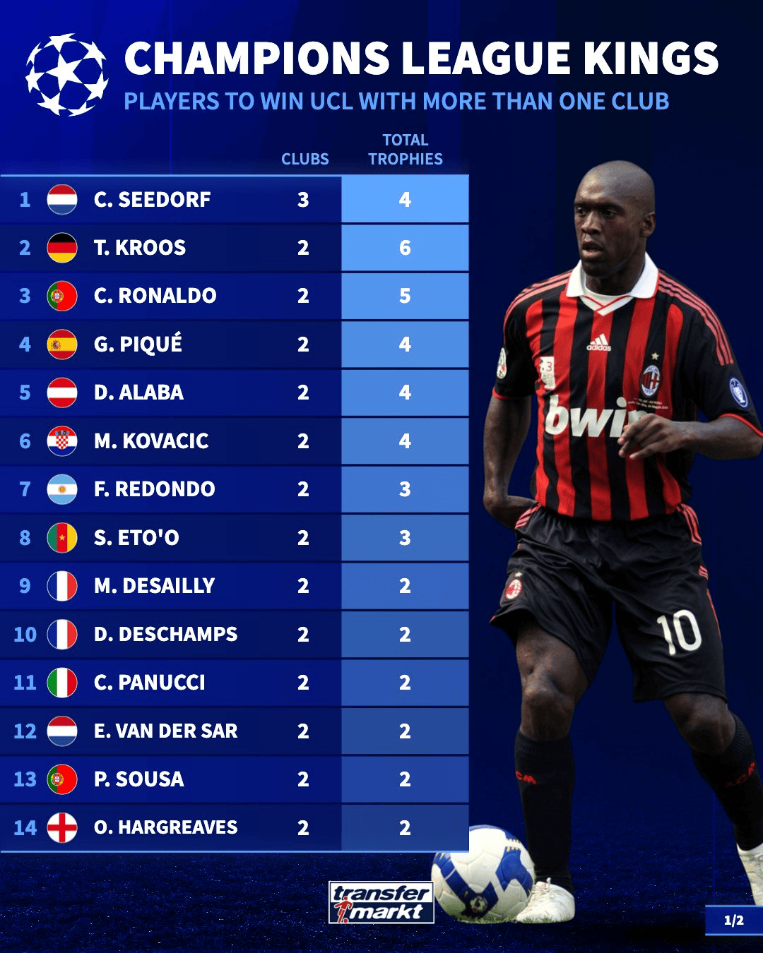 虎扑02月16日讯德国转会市场盘点了跟随过不止一家俱乐部获得欧冠奖杯的球员,详情如下: