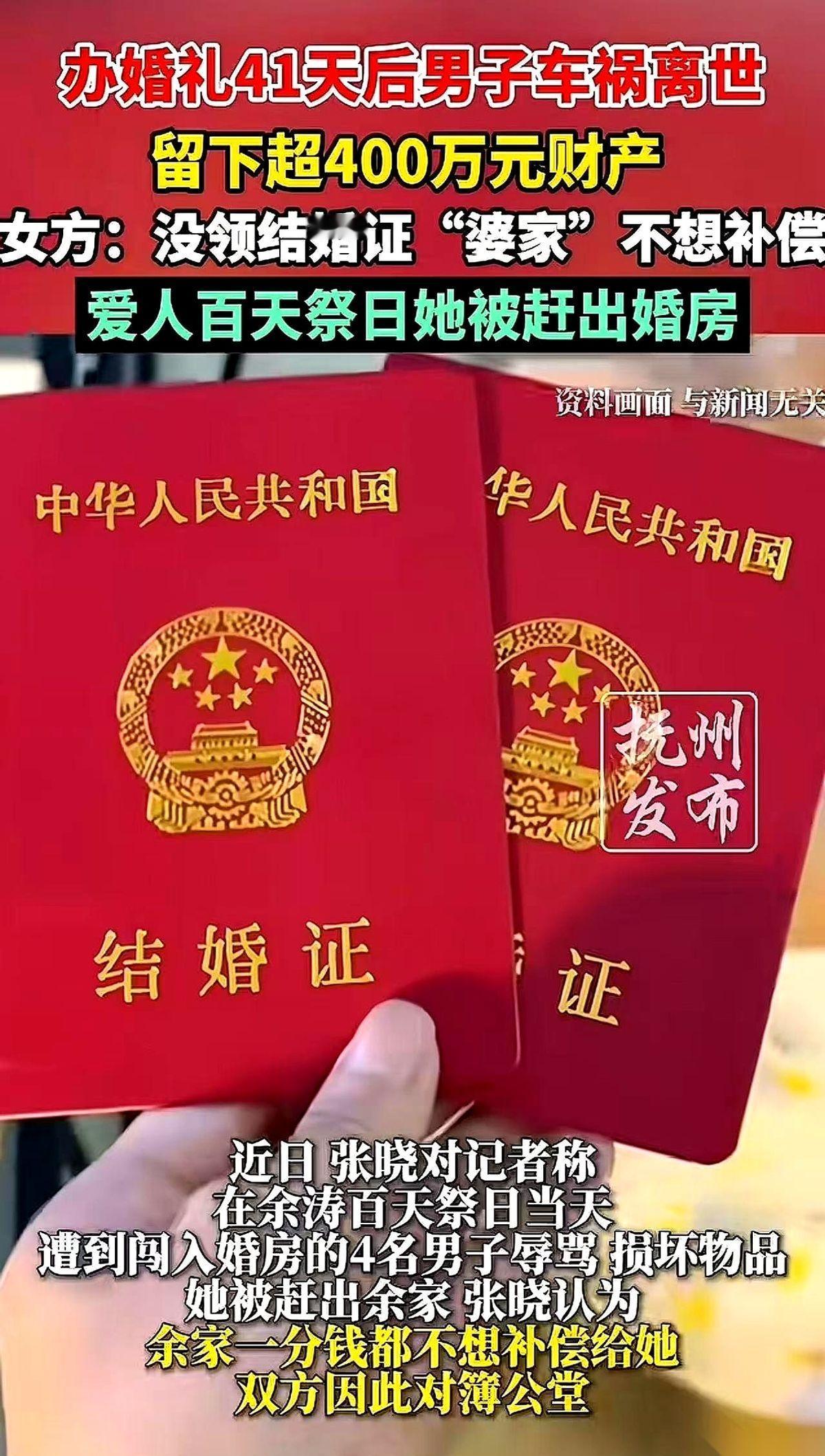 刚给老公抱完骨灰盒,端完灵位,一回头,婆婆就把400万遗产全攥自己手里了。 更绝的是,连他们结婚的婚房,都把这姑娘的行李给扔了出来。 就因为一张纸,一张没来得及领的结婚证。 你说可笑不可笑? 婚礼办了,全村人都来喝了喜酒,两口子日子也过了41天了。 结果男人一出事,没了,办后事的时候,是她这个“妻子”在灵前哭得撕心裂肺,打砂锅、抱骨灰盒,所有人都认她是这家儿媳妇。 转过头来,婆婆就跟她算账了。 “你们没领证,法律上你俩就没关系。” “我儿子的钱,你一分都别想拿。” 我以为这就够狠了,没想到人心能这么凉。 姑娘去法院起诉,要个说法,法院驳回了,说你没资格。 婆婆那边一看,乐了,反手就把这姑娘给告了,让她退还18.8万的彩礼和所有金首饰。 这是什么操作? 这就是告诉你,我儿子没了,你不仅得净身出户,还得把当年吃的饭都吐出来,最好再背一身债滚蛋。 这事儿真给所有人上了一课。 别再信什么“婚礼比那张纸重要”的鬼话了。 在真金白银和人性面前,那张薄薄的纸,就是你的铠甲,是你最后的底牌。 不然,你以为你是未亡人,在人家眼里,你就是个外人。 你为他披麻戴孝,人家当你是来奔丧的。