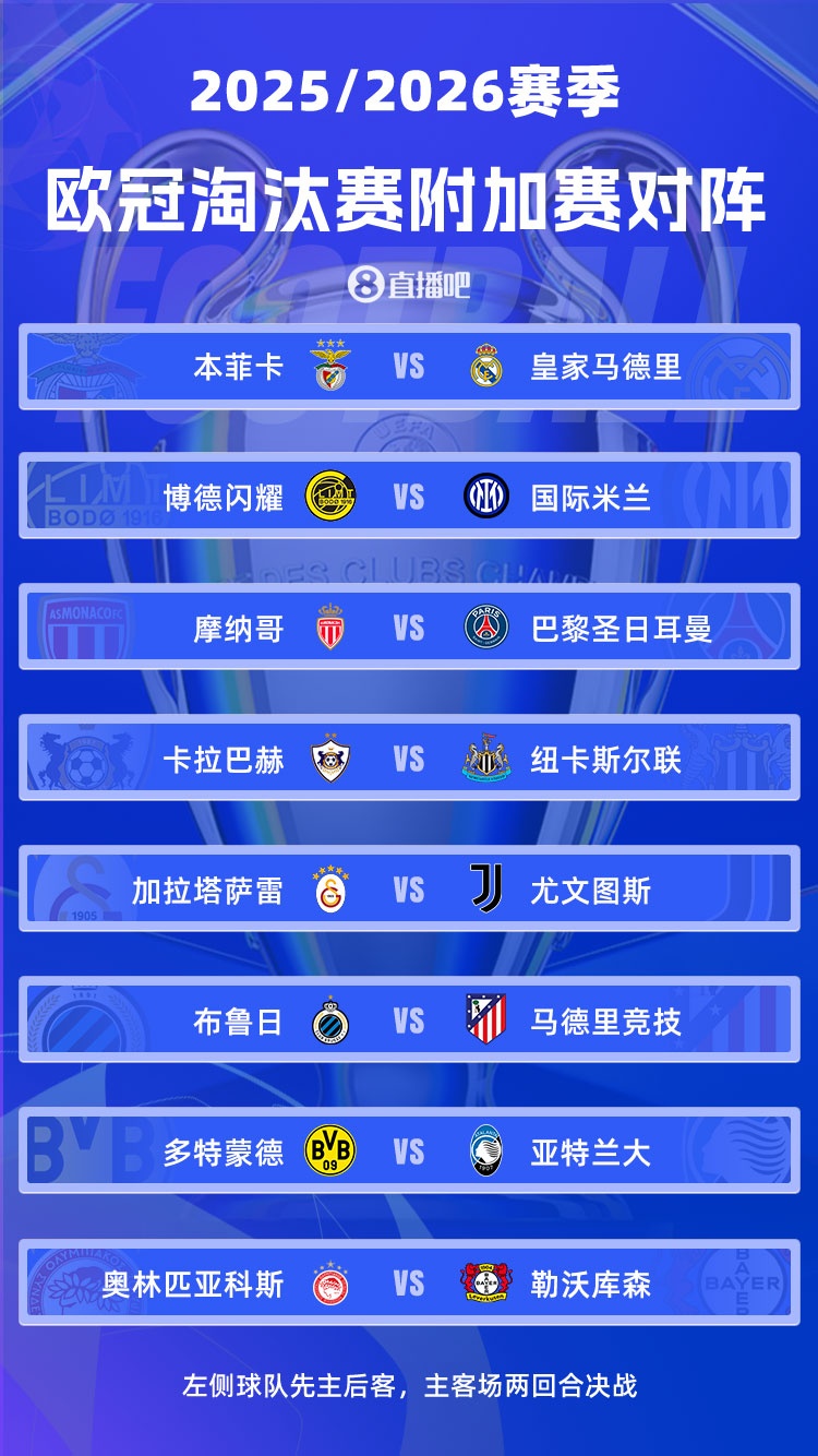 直播吧02月17日讯马年的春节期间,25/26赛季欧冠淘汰赛附加赛开战。多家欧洲豪门将在附加赛登场,迎来首回合的交锋。吧友们敬请锁定直播吧,一起在春节享受欧冠盛宴!