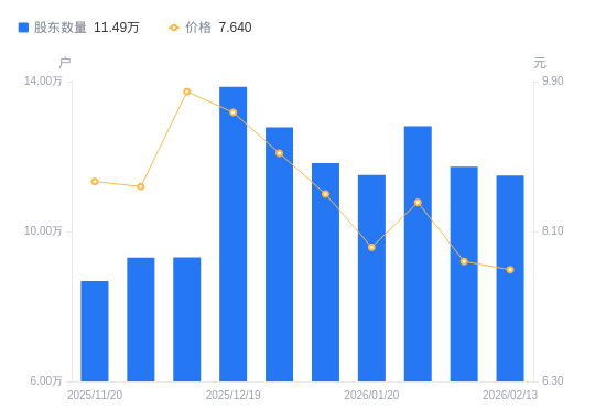 日期A股户数(户)流通A股户均持股数(股)户均持股市值(万元)2026-02-1311490010016.517.652026-02-101173009811.577.592026-01-301281008984.377.592026-01-201151009999.117.912026-01-091182009736.878.332025-12-311278009005.468.142025-12-191386008303.737.912025-12-109310012361.9512.092025-11-289300012375.2410.692025-11-208680013259.1911.54