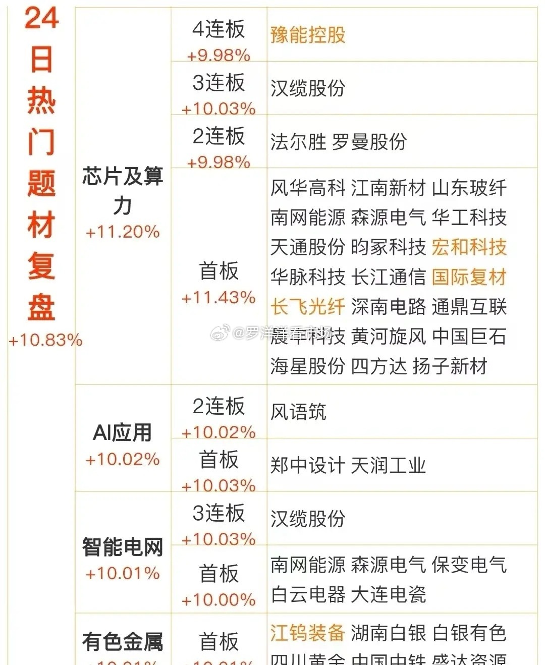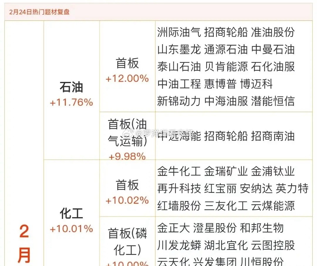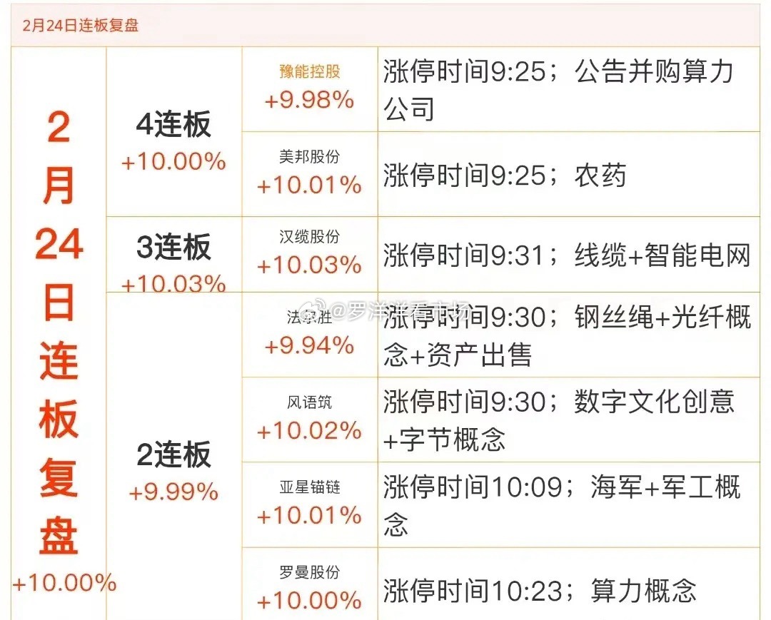 2月24日A股情绪拉满,豫能控股、美邦股份4连板领跑。石油、化工领涨市场,芯片算力、AI应用、智能电网同步活跃。磷化工产业链强势爆发,磷矿、黄磷等细分方向涨幅居前,连板梯队完整,题材轮动加速。2月24日连板梯队清晰出炉:豫能控股、美邦股份携手晋级4连板,前者并购算力公司,后者深耕农药领域,均以一字涨停彰显强势。汉缆股份拿下3连板,坐稳智能电网主线龙头。工全线爆发!黄磷板块强势涨停,磷矿大涨近10%,磷肥、农药同步走强,过磷酸钙更是暴涨超13%!云天化、兴发集团、湖北宜化等龙头股集体发力,上下游产业链共振拉升,成为今日市场最强主线之一!