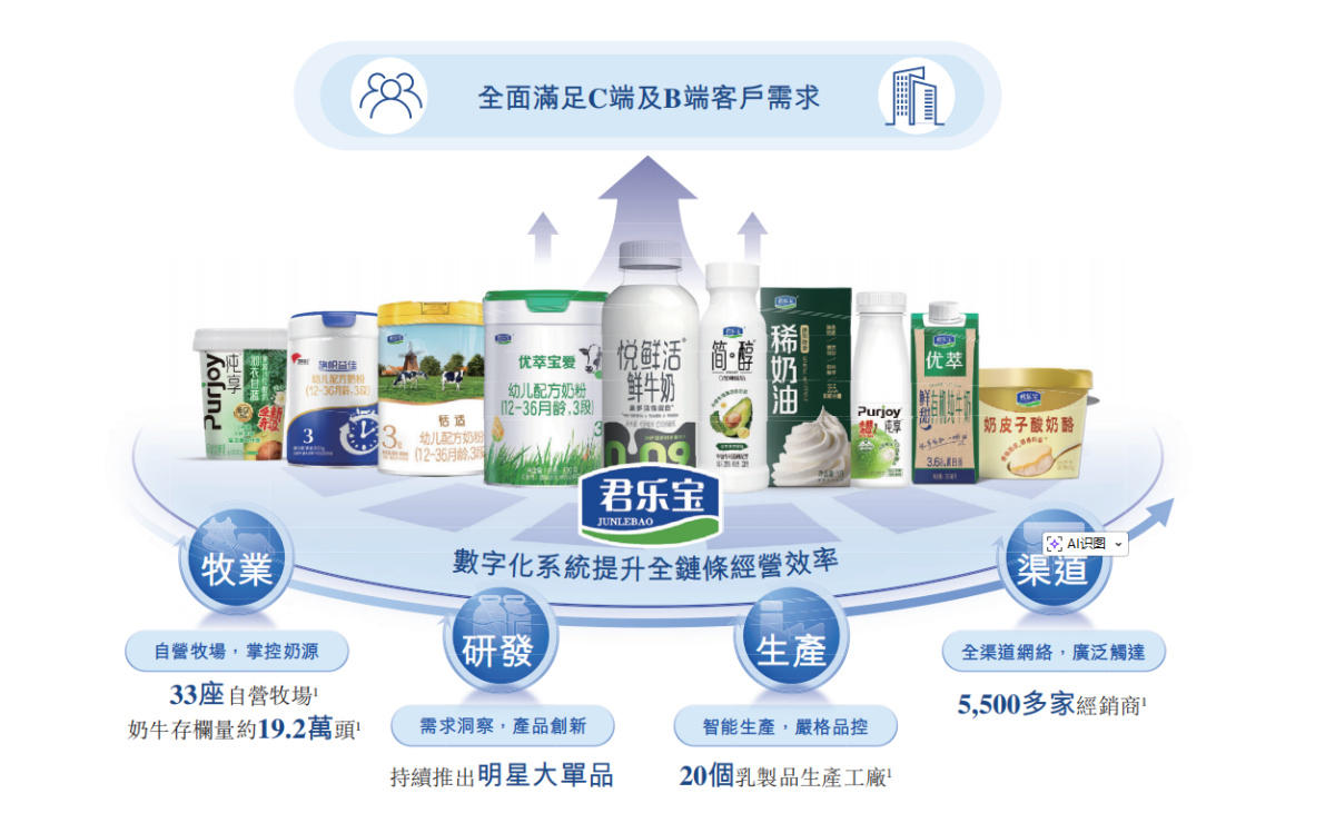 从业务布局来看,君乐宝已构建起覆盖液奶产品、奶粉、其他乳品及牧业的多元化业务体系,形成全产业链一体化运营模式,核心C端产品包括简醇、悦鲜活、纯享、君乐宝、银桥、来思尔等。