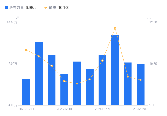 日期A股户数(户)流通A股户均持股数(股)户均持股市值(万元)2026-02-13699286280.026.342026-01-30709706187.816.342026-01-20911974815.395.952026-01-09765085739.916.292025-12-31664006613.696.702025-12-19718296113.816.082025-12-10626557009.007.042025-11-28763545751.496.172025-11-20859135111.555.692025-11-10591437425.218.47