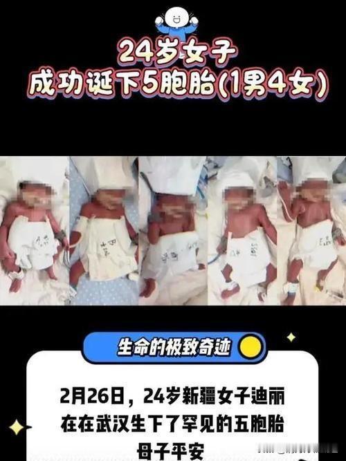 2月26日,武汉一间医院迎来了一场生命的奇迹——新疆妈妈迪丽在20多位医护人员的紧密接力下,成功自然分娩罕见的五胞胎,母子平安。 这个消息迅速引发社会关注,因为全球自然受孕五胞胎的概率仅为六千万分之一,堪称生命的极致奇迹。 这场生命的诞生不仅仅是医学上的壮举,更是对母亲坚韧意志和医护团队专业精神的生动诠释。从孕期的精心监护到分娩时的紧张协作,每一个环节都体现出医疗团队的责任与担当。 迪丽妈妈面对罕见的高风险孕育,展现出的坚强与乐观,更让人感受到生命的韧性与伟大。 然而,这背后也让我们思考现代社会对多胞胎家庭的支持体系是否足够完善。五胞胎的降临,意味着家庭将面临极大的经济和教育压力。 如何确保这些新生命能够健康成长,接受良好教育,成为社会关注的焦点。教育资源的合理配置、社会保障的完善,都是我们必须面对的问题。 迪丽妈妈的故事,不仅激励着无数家庭珍惜生命、勇敢面对挑战,也提醒我们,社会应给予更多关爱和支持给这些特殊的家庭。 每一个生命都是独一无二的奇迹,每一份努力都值得尊重和赞扬。 你是否也被这场生命奇迹所感动?你认为社会应该如何更好地支持多胞胎家庭?欢迎留言分享你的看法,让我们一起为生命喝彩,为爱发声!