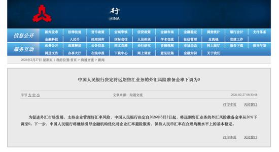 2月27日上午,央行官网发布消息称,为促进外汇市场发展,支持企业管理好汇率风险,中国人民银行决定自2026年3月2日起,将远期售汇业务的外汇风险准备金率从20%下调至0。下一步,中国人民银行将继续引导金融机构优化对企业汇率避险服务,保持人民币汇率在合理均衡水平上的基本稳定。