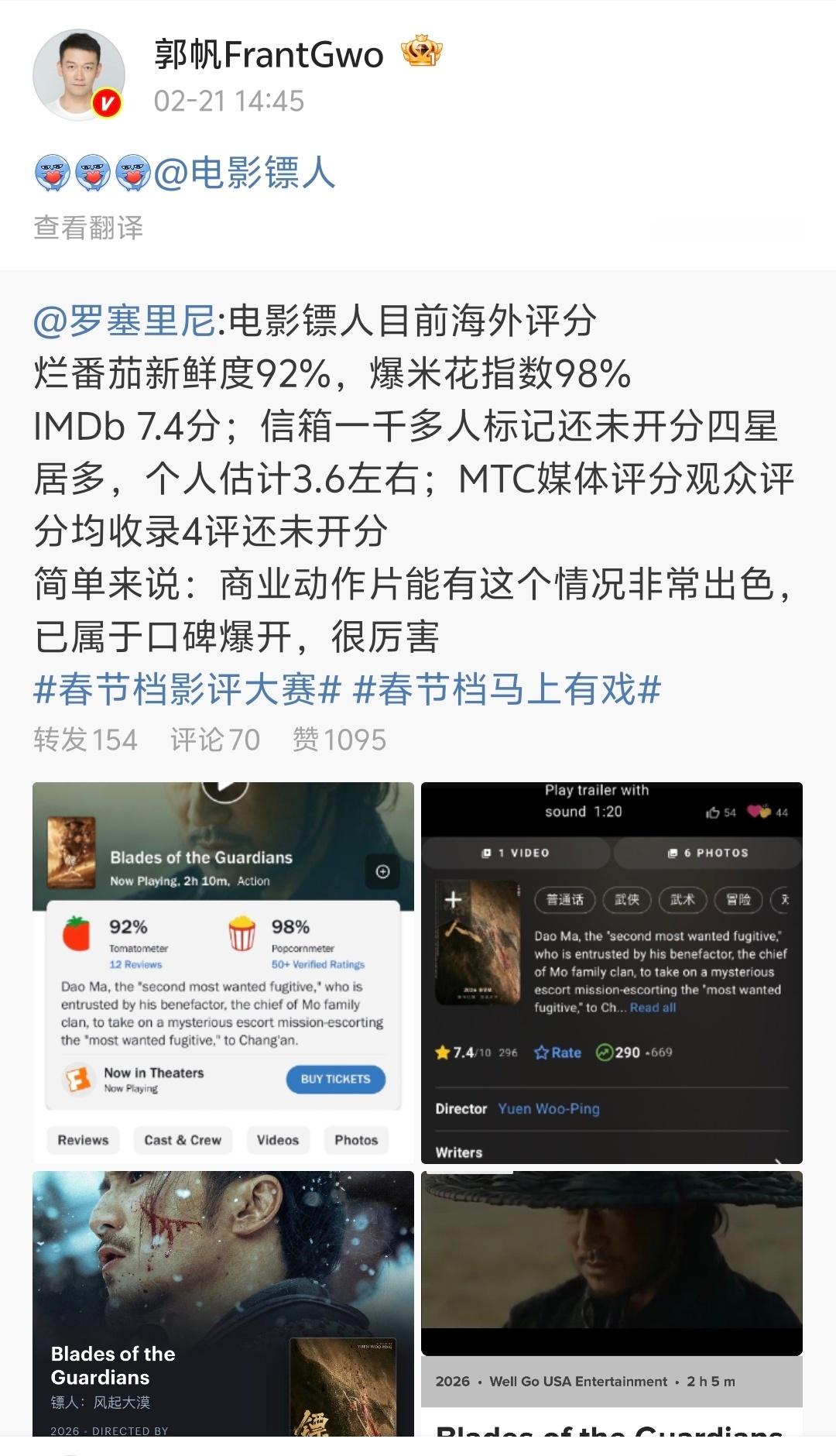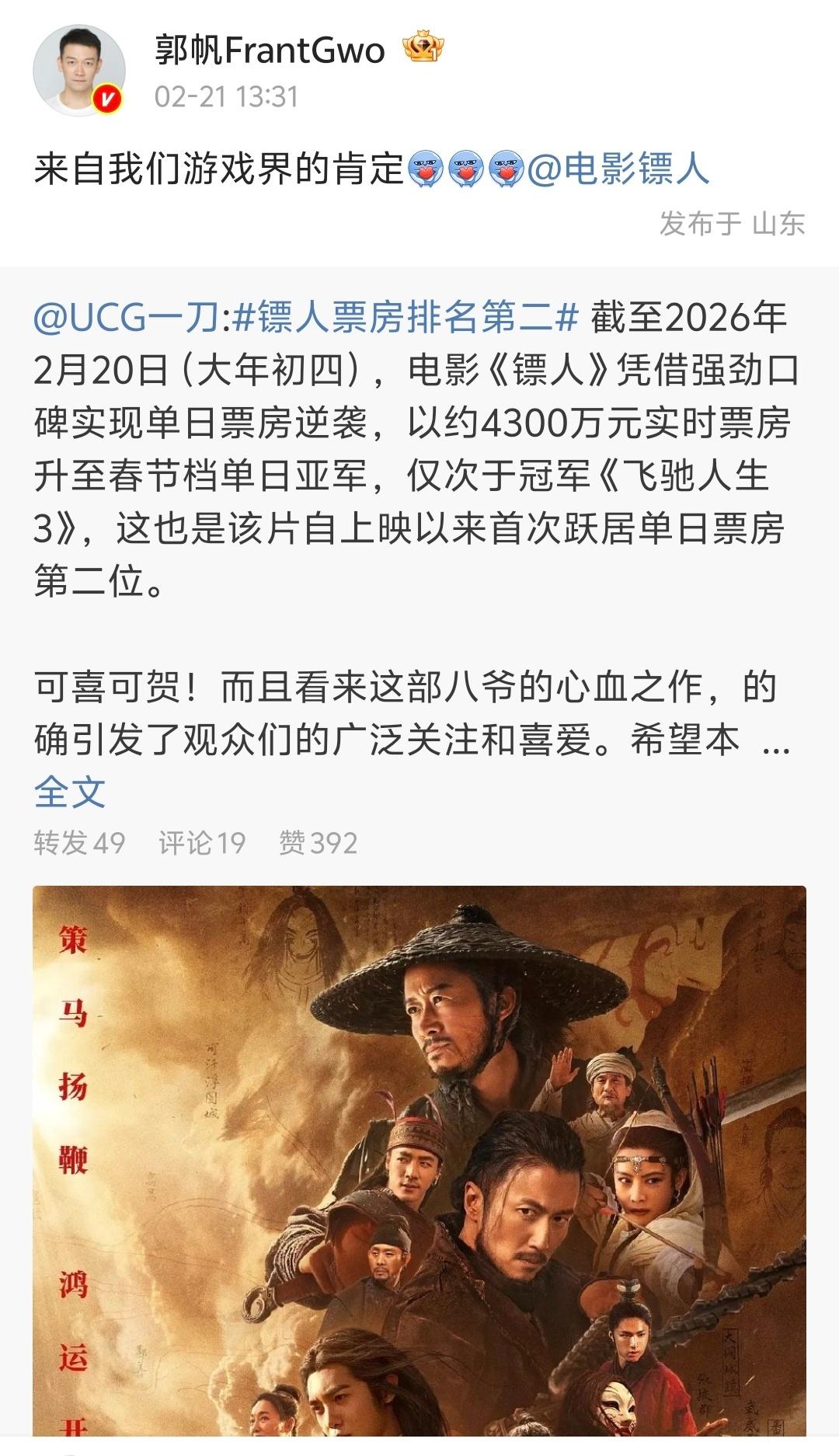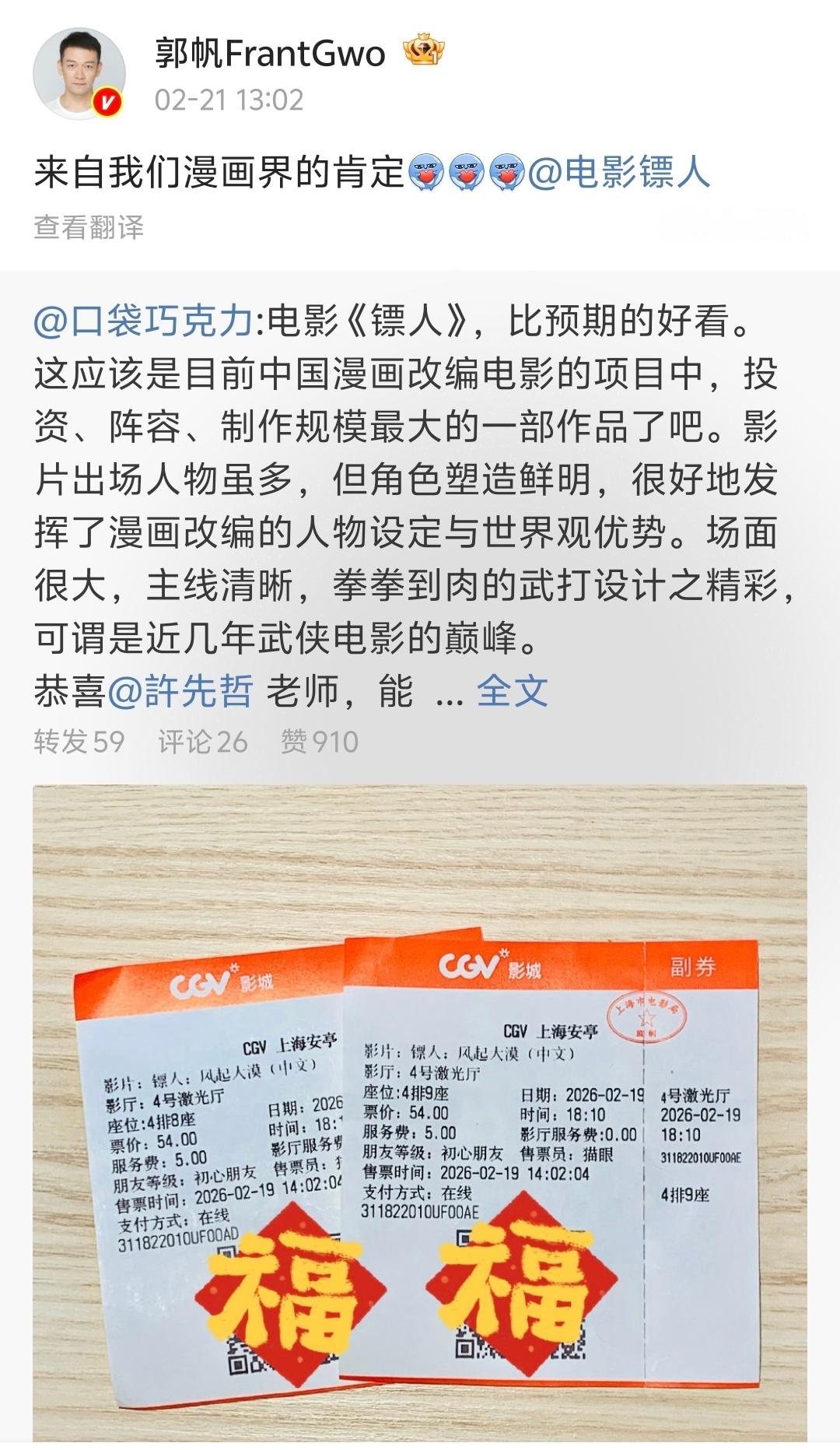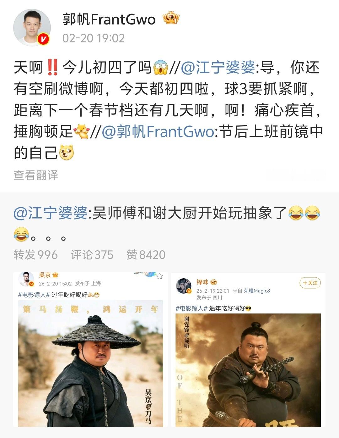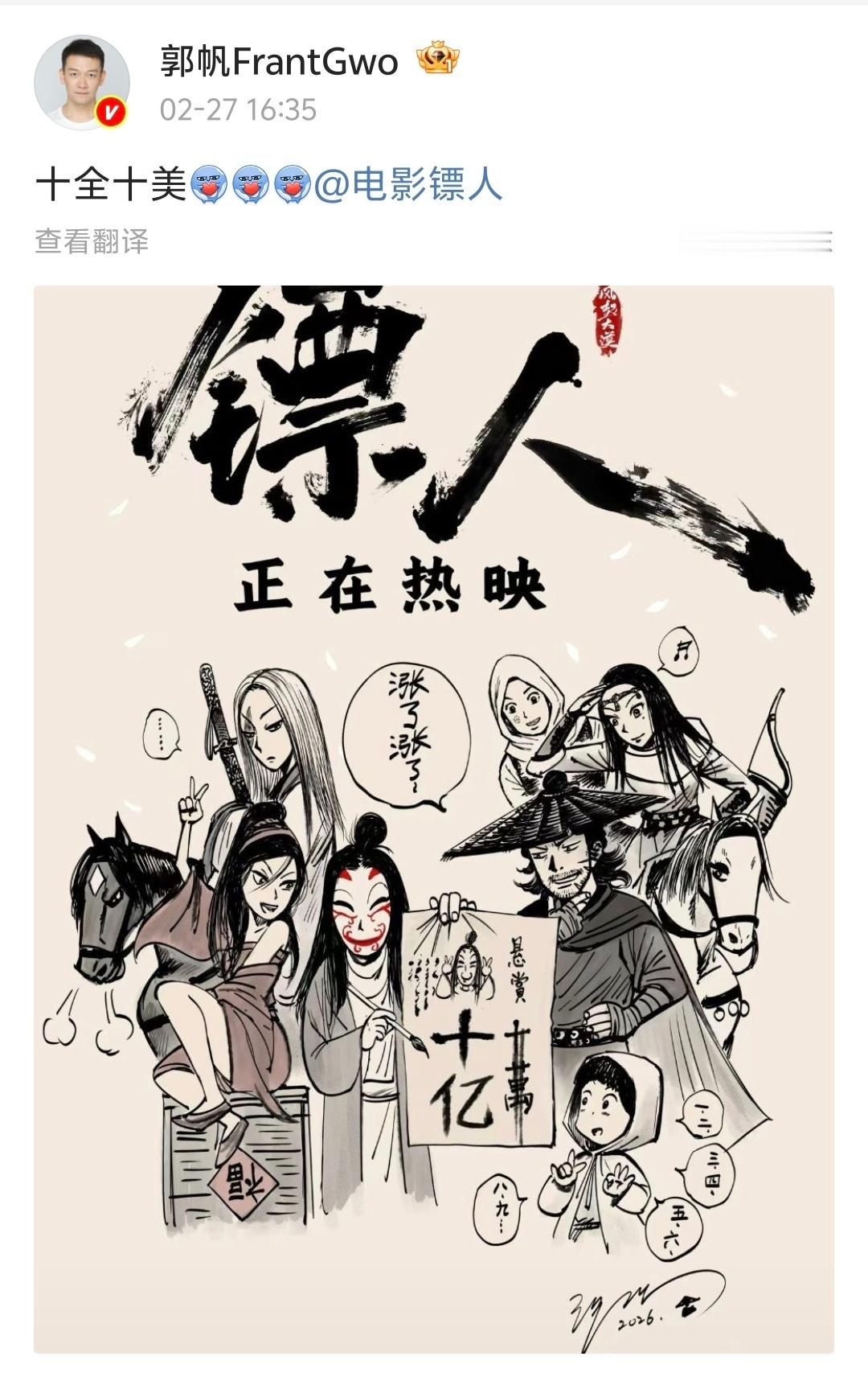 【郭帆镖人全肯定bot】郭帆全自动镖人转发bot 大家都来看看这个导演啊,每天微博都是镖人镖人镖人镖人……偶尔来一句“对对对还有破球,差点忘了”一款《镖人》和 的全肯定bot!今天,电影《镖人》累计票房过10亿,郭帆也第一时间晒出了亲手绘制的贺图:“十全十美”他真的超爱!