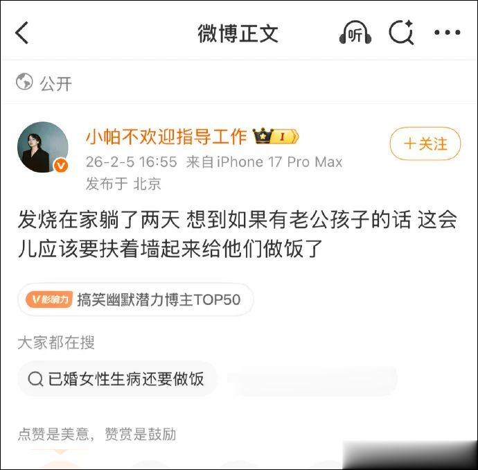 账号@小帕不欢迎指导工作发布挑动性别对立、制造婚育焦虑信息,因违反相关法律法规和上述专项行动要求,被责令予以禁言处置,平台作为执行方执行禁言要求。也呼吁广大用户,在参与公共议题讨论时不刻意关联性别议题、不制造群体仇恨,不树立引战对立人设,保证自身创作安全的同时,维护清朗网络环境,让我们一起向性别对立说不。