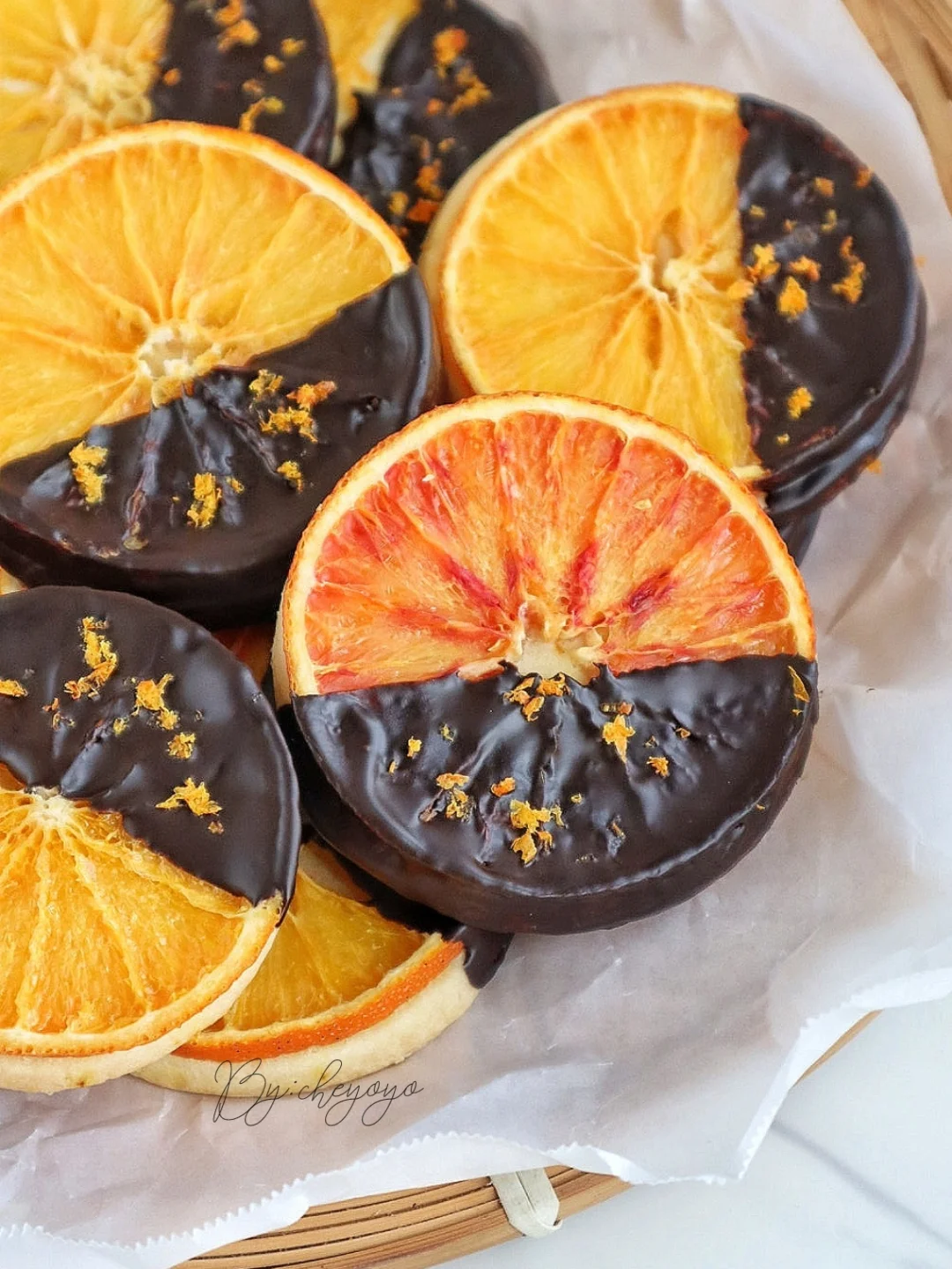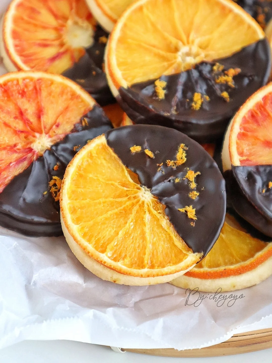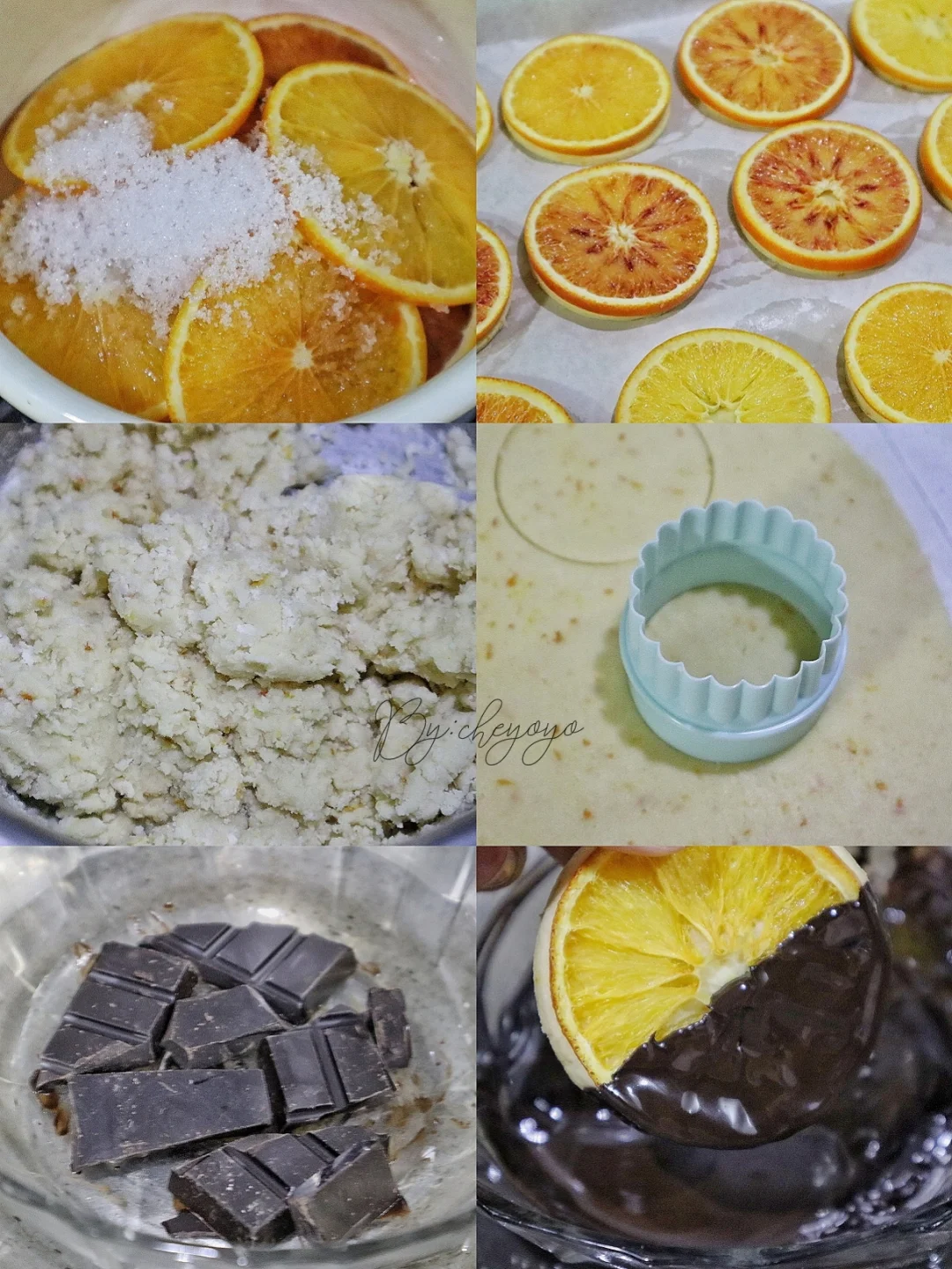 香橙+巧克力的搭配真的太绝了,外酥里软,橙香四溢,完全不腻,越吃越上头!做法简单,不用打发哦😋 - 🌟食材🌟 *糖渍香橙 橙子……2个 砂糖……15g 清水……30g *香橙曲奇 黄油……80g 金砂糖……20g 盐……1撮 橙汁……20g 低筋面粉……140g 橙子皮屑……适量 黑巧克力……适量 - 🌟做法🌟 1️⃣ 用盐将橙子表面搓洗干净,切薄片;锅中加入清水、砂糖煮开,放入橙子片煮5分钟捞出,用厨房纸吸出多余水分备用;剩余橙子削皮屑、榨汁; 2️⃣ 黄油室温软化至用手指可轻松戳出小洞,加入金砂糖、盐搅拌至均匀顺滑,分次加入橙汁搅拌均匀,加入低筋面粉、一半橙子皮屑,翻拌至无干粉后揉成团; 3️⃣ 面团擀成4mm面饼,送入冷箱冷冻15分钟定型,用圆形模具(比橙子片小一圈)压出曲奇形状后摆到烤盘上,放上糖渍橙子片; 4️⃣ 送入160度烤箱烘烤40分钟,最后10分钟加盖锡纸防止变色,出炉移至晾网上冷却; 5️⃣ 黑巧克力隔热水融化,曲奇一端裹上巧克力,撒上橙子皮屑,送入冰箱冷藏至巧克力凝固就ok啦😍😍