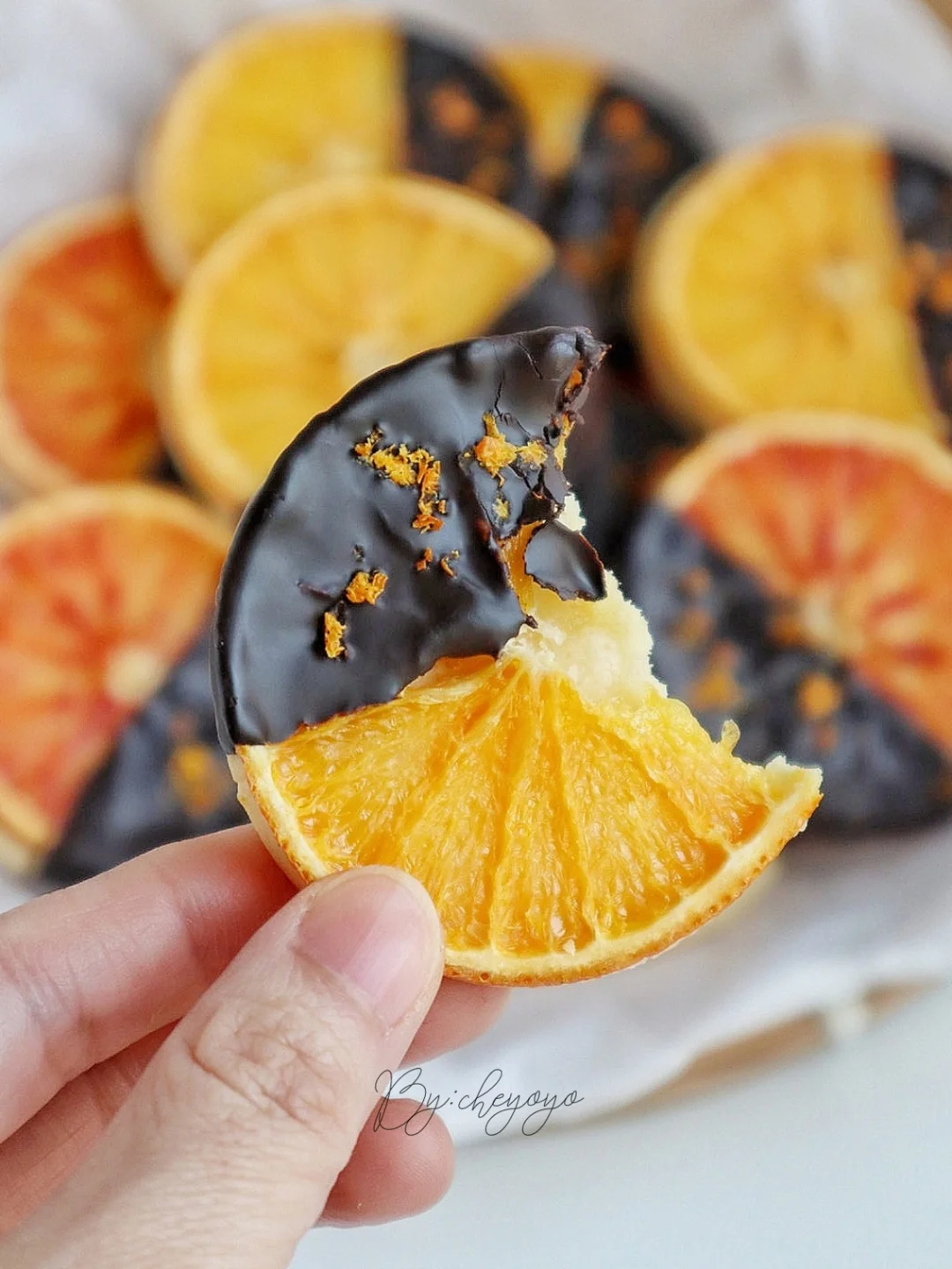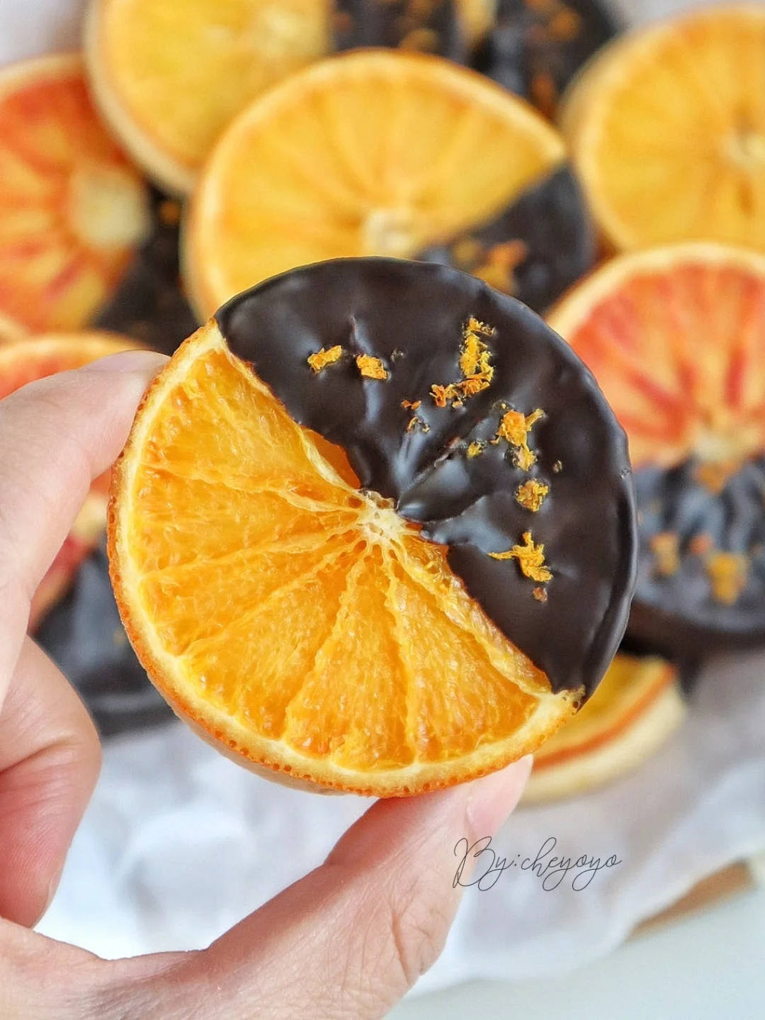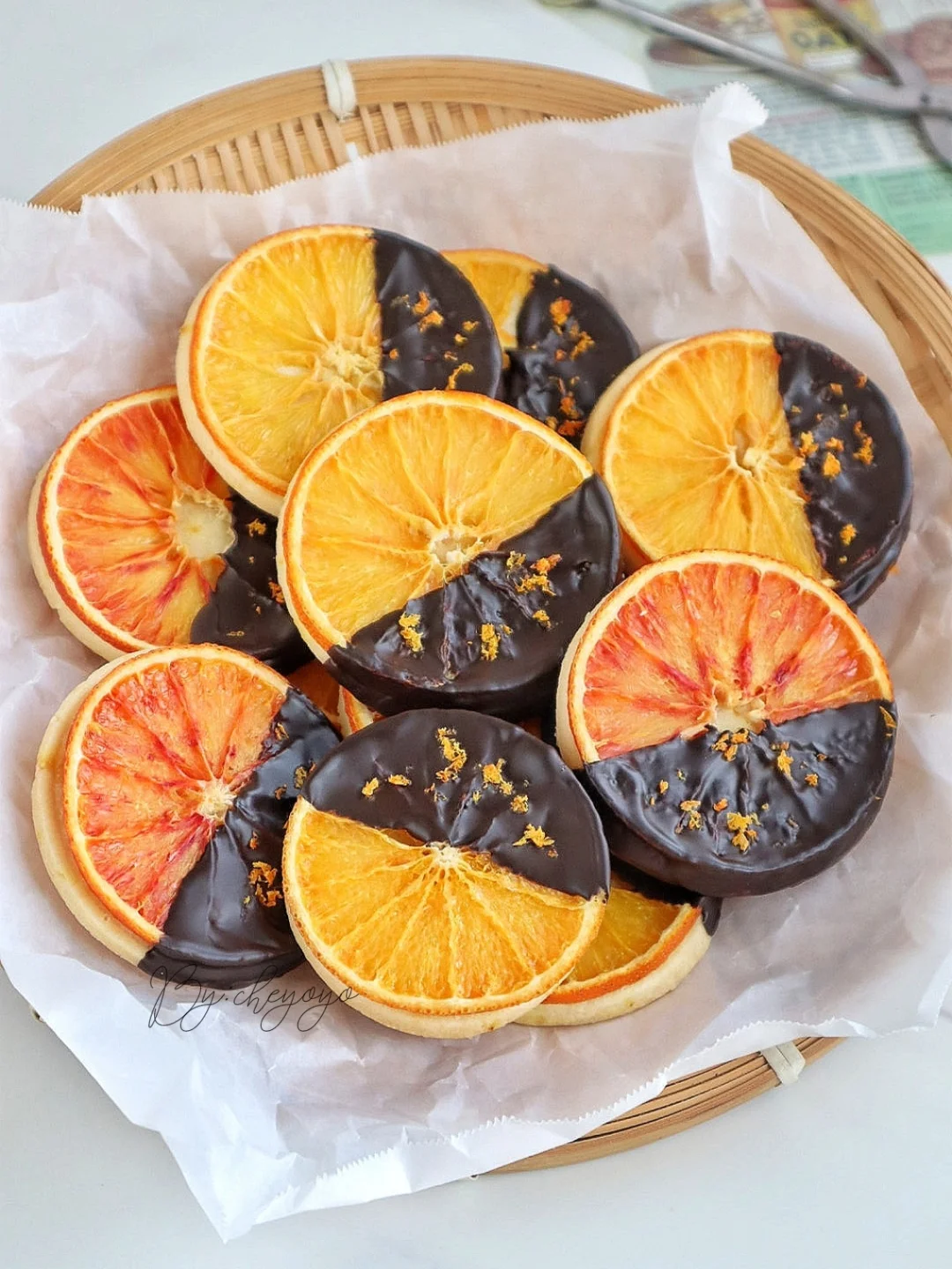 香橙+巧克力的搭配真的太绝了,外酥里软,橙香四溢,完全不腻,越吃越上头!做法简单,不用打发哦😋 - 🌟食材🌟 *糖渍香橙 橙子……2个 砂糖……15g 清水……30g *香橙曲奇 黄油……80g 金砂糖……20g 盐……1撮 橙汁……20g 低筋面粉……140g 橙子皮屑……适量 黑巧克力……适量 - 🌟做法🌟 1️⃣ 用盐将橙子表面搓洗干净,切薄片;锅中加入清水、砂糖煮开,放入橙子片煮5分钟捞出,用厨房纸吸出多余水分备用;剩余橙子削皮屑、榨汁; 2️⃣ 黄油室温软化至用手指可轻松戳出小洞,加入金砂糖、盐搅拌至均匀顺滑,分次加入橙汁搅拌均匀,加入低筋面粉、一半橙子皮屑,翻拌至无干粉后揉成团; 3️⃣ 面团擀成4mm面饼,送入冷箱冷冻15分钟定型,用圆形模具(比橙子片小一圈)压出曲奇形状后摆到烤盘上,放上糖渍橙子片; 4️⃣ 送入160度烤箱烘烤40分钟,最后10分钟加盖锡纸防止变色,出炉移至晾网上冷却; 5️⃣ 黑巧克力隔热水融化,曲奇一端裹上巧克力,撒上橙子皮屑,送入冰箱冷藏至巧克力凝固就ok啦😍😍