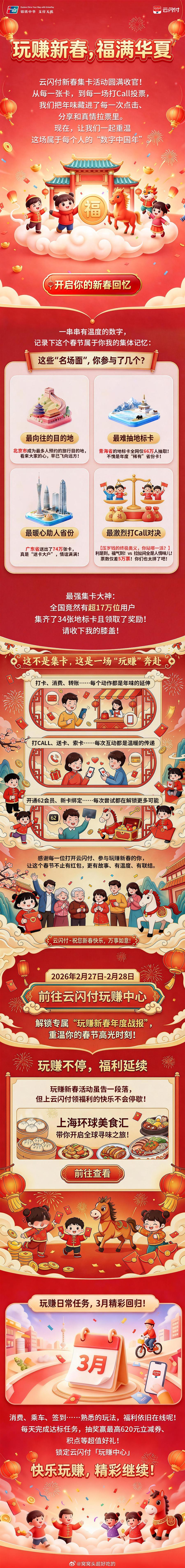 云闪付如何把集卡做成新年俗?「玩赚新春 福满华夏」集卡活动战报2月27日-28日限时开放,快来查看你的集卡成就、打CALL战绩、获奖记录!为什么年轻人开始在手机上“集卡过年”?因为云闪付「玩赚新春」却让千万人找回了仪式感。一张家乡地标卡,一场好友打CALL战,一次红包瓜分——这些微小但确定的互动,构成了数字时代的新年俗。不只是因为它发福利,而是因为它让“集卡”变成了一种社交货币、一种春节仪式、一种情感刚需。一张地标卡,让异乡人有了归属感;一次换卡成功,让好友关系多了一次互动理由。玩赚新春福满华夏锦绣团圆好礼惠聚四海一家中国银联云闪付玩赚云闪付玩赚中心