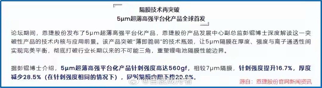 这份差距,源于恩捷股份在隔膜领域的深耕。自2010年切入该领域,公司已积累宁德时代、比亚迪、LG新能源等全球顶尖客户,2025年隔膜出货量近100亿平方米,以超30%的市占率连续八年稳居全国第一。更关键的是产品力:2025年下半年推出的5µm超薄高强隔膜,厚度较7µm减少28.5%,针刺强度提升16.7%,适配快充与储能需求,且凭借更高溢价成为盈利支撑。