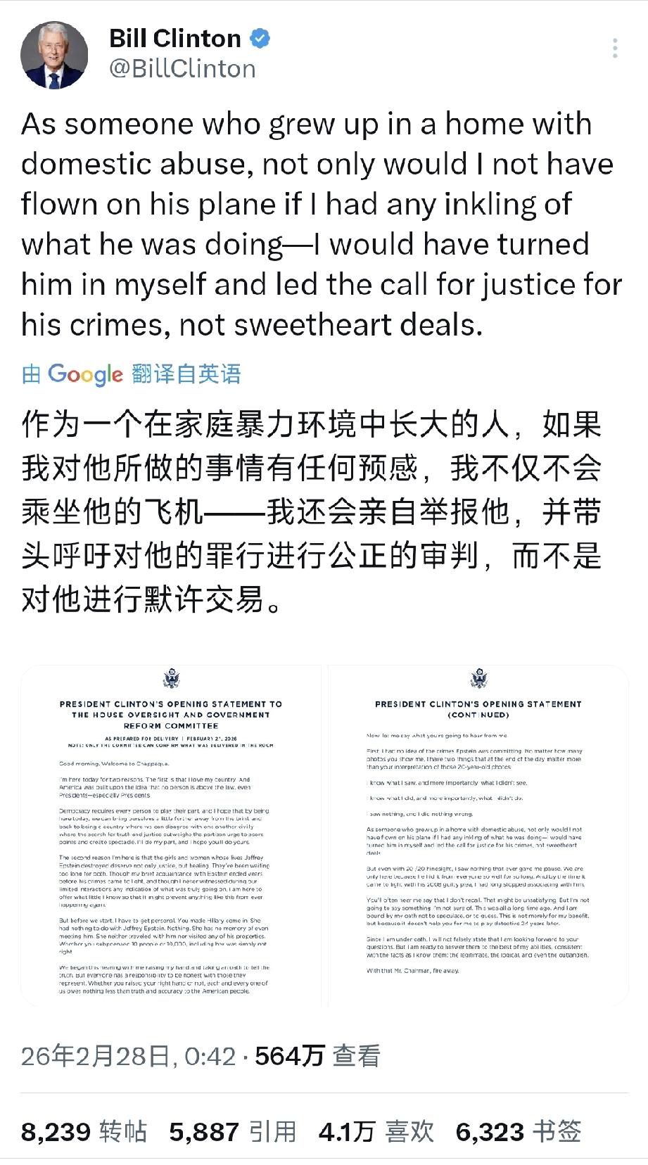 美国前总统比尔·克林顿今天(北京时间2月28日)写道:“作为一个在家庭暴力环境中长大的人,如果我对他所做的事情有任何预感,我不仅不会乘坐他的飞机我还会亲自举报他,并带头呼吁对他的罪行进行公正的审判,而不是对他进行默许交易。” [机智]评几句:美国前总统比尔·克林顿为自己与爱泼斯坦的关联辩解,非但未洗清嫌疑,反而引发舆论更大争议。以童年家暴经历为借口,声称对爱泼斯坦的罪行毫无预感,这番说辞苍白又牵强,既无视其多次搭乘爱泼斯坦私人飞机的铁证,也回避了外界对其与案涉人员往来的诸多质疑。所谓会亲自举报、呼吁公正审判的假设,更像是事后的虚伪表态,难以服众。公众真正质疑的,从来不是其是否有预感,而是权贵圈层对恶行的默许与纵容,克林顿的解释避重就轻,只谈个人感受不谈实际关联,只会让外界对其说辞的可信度打上更大问号,也让权贵圈层的隐秘交易更受诟病。