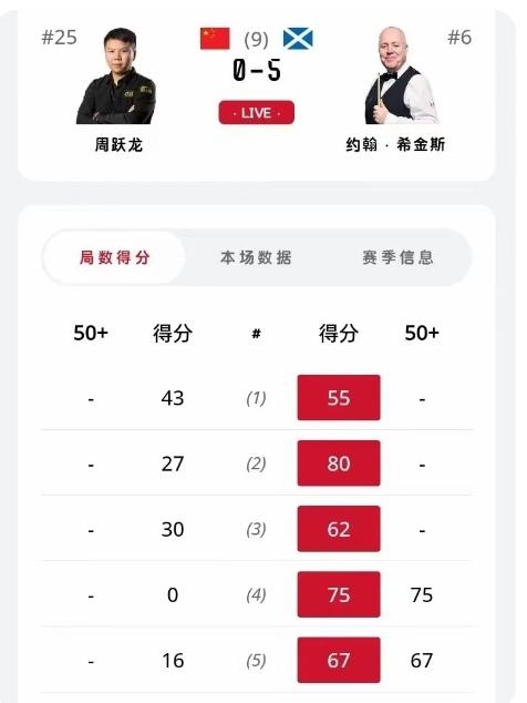 周跃龙0-5完败希金斯无缘威尔士公开赛四强!冲击本土系列赛奖金前功尽弃 在今天凌晨刚刚结束的斯诺克威尔士公开赛的四分之一决赛中,中国名将周跃龙挑战七五三杰之一的希金斯。周跃龙状态低迷,失误不断,虽然有机会,但是没有把握住。最终0-5完败希金斯。无缘晋级威尔士公开赛的四强。同时,争夺本土系列赛15万英镑奖金的机会也前功尽弃。比赛过程如下! 第一局,双方打的难解难分,比分咬的很紧,周跃龙本有机会拿下,但是关键时刻掉链子,最终希金斯55:43惊险拿下首局,取得开门红。 第二局,希金斯凭借零敲碎打得分,80:27再下一局,连赢两局局分2-0领先。 第三局,开局阶段周跃龙领先,但是进攻中袋红球不进,希金斯笑纳大礼。62:30单局逆转获胜,一波三连鞭局分3-0领先。 第四局,希金斯凭借成功的防守,没有给周跃龙机会。希金斯75:0拿下此局,一波四连鞭率先拿到赛点,进入中间休息。 第五局,周跃龙率先上手,但是又出现失误,希金斯做出高质量的防守,周跃龙解球漏球。希金斯两次上手67:16获胜,一波五连鞭零封周跃龙,希金斯晋级四强。 周跃龙关键时刻总是掉链子,难过心态这一关,需要好好调整心态。斯诺克签表 威尔士斯诺克