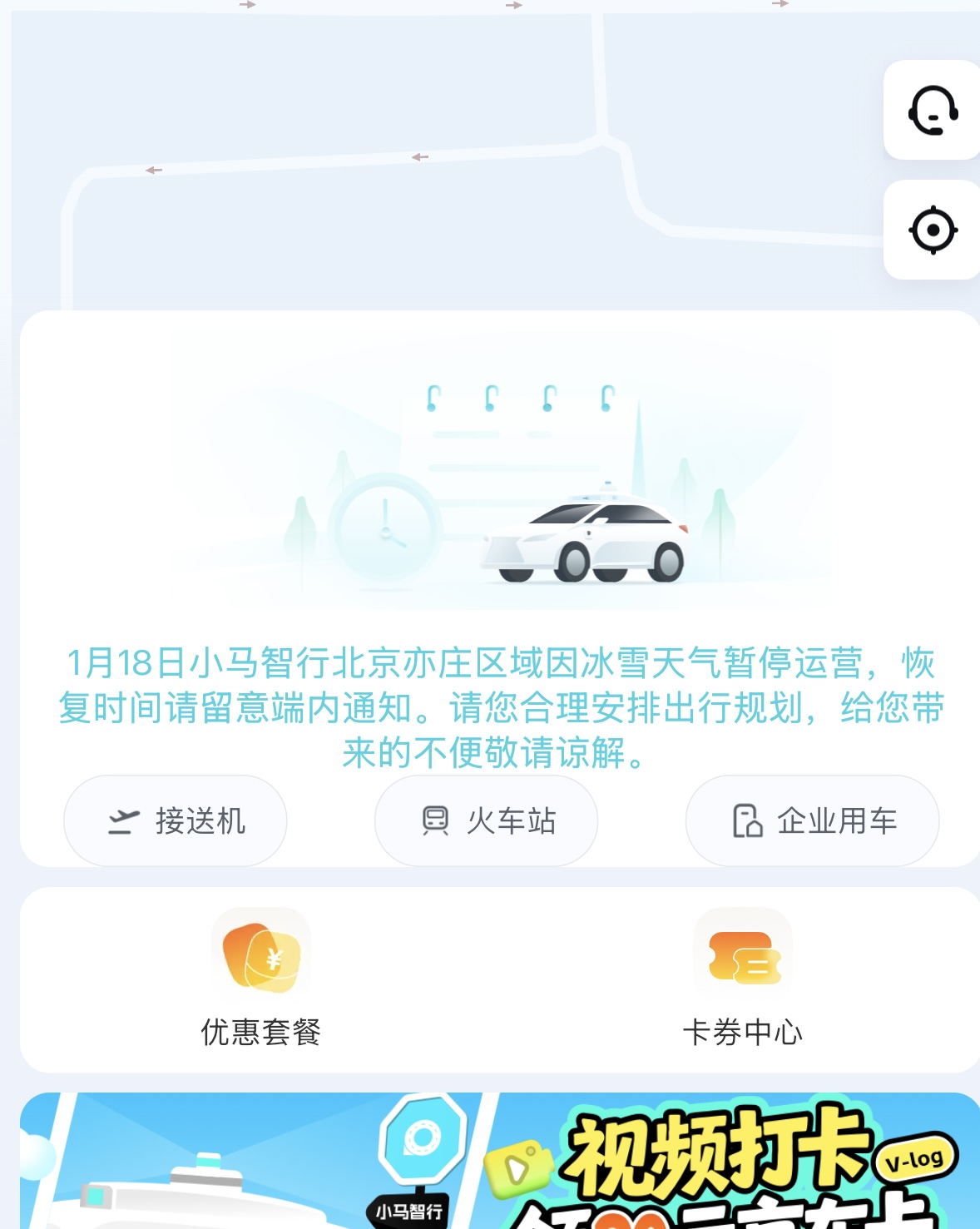 1月18日,北京降雪,界面新闻记者注意到,小马智行的官方APP显示“暂停运营”通知截图。