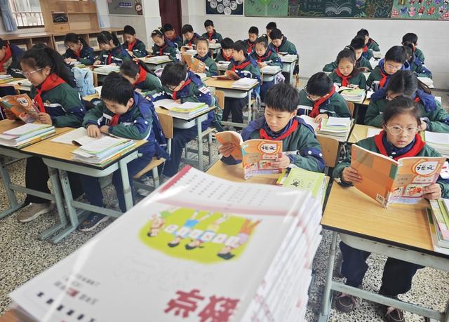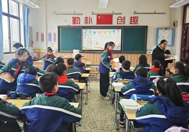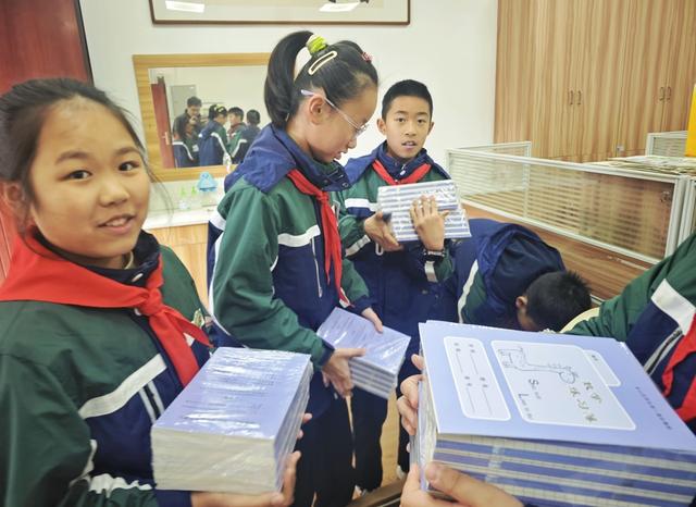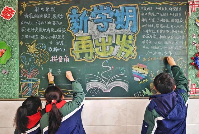 2月28日上午,在上海市金山区第一实验小学,静谧的校园又重新热闹起来,返校的孩子们绘制展望新学期的主题板报,教材分发工作也有序进行。