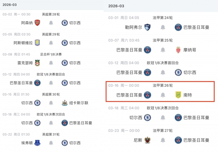 目前,切尔西三月份要踢7场比赛,其中包括对阵阿森纳、维拉、纽卡、埃弗顿的英超比赛,以及足总杯对阵雷克瑟姆的1/8决赛。