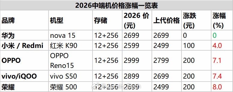 热搜炸了!中国手机行业将迎来全面涨价受AI产业挤压存储芯片产能,成本失控暴涨,3月起全品牌、全品类同步涨价,三星S26直接上调100美元,大存储机型价格更是一路飙升!