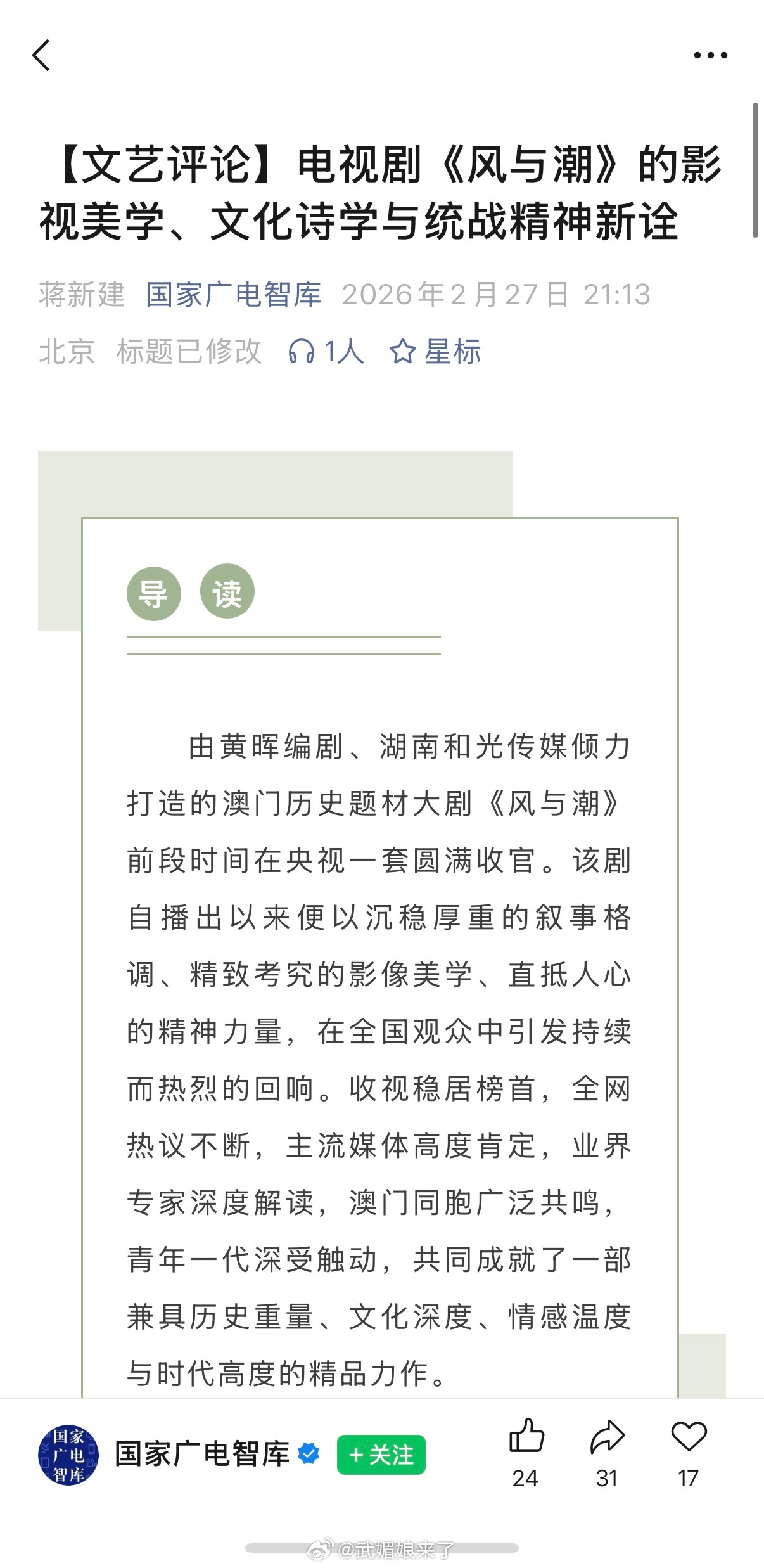 “从收视登顶到全网共情,从业界盛赞到观众动容,从澳门回响到青年共鸣,《风与潮》的成功,是匠心与初心的成功,是文化与精神的成功,是历史与时代的成功。”