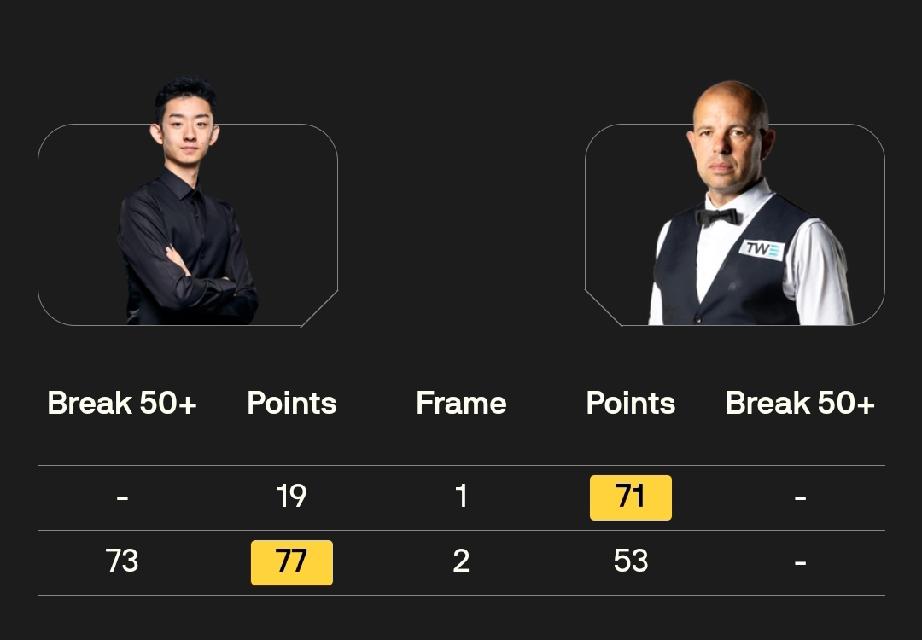 吴宜泽 1-1 巴里·霍金斯 2月28日21点,斯诺克威尔士公开赛第一场半决赛,吴宜泽对阵巴里·霍金斯,11局6胜赛制。 1/4决赛,吴宜泽1-4落后连扳4局5-4绝杀江俊;巴里·霍金斯爆冷5-3击败尼尔·罗伯逊。 赛前,机构和媒体看好巴里·霍金斯获胜晋级决赛。 巴里·霍金斯拿下第一局!吴宜泽单杆73分扳平比分。
