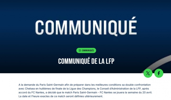 应巴黎圣日耳曼的要求,为了更好地备战与切尔西的欧冠联赛1/8决赛两回合比赛,经与南特俱乐部协商,法国职业足球联盟理事会决定将巴黎圣日耳曼与南特的比赛推迟至4月20日当周进行。确切比赛日期和开球时间将稍后公布。
