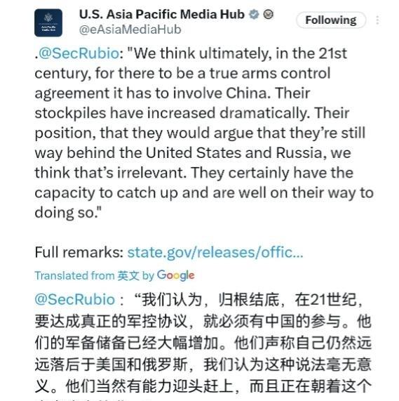 不认同中国的立场!26日,美国国务卿鲁比奥再次点名中国。他表示在当前的国际环境下,任何真正意义上的军控协议,如果不能把中国纳入其中,都将失去价值。鲁比奥甚至抛出了一个非常强硬的判断:中国坚持认为自身核力量远落后于美俄,这种立场在美方看来已经“毫无意义”。他强调中国正稳步朝着迎头赶上的目标前进,美国必须提前做出反应。 鲁比奥的言辞逻辑其实非常清晰:他不再纠结于中国现在手里有多少底牌,而是盯准了中国未来的增速。他试图通过否认“规模差距”的存在,强行把一个尚在“防御性规模”内的国家,拉进两个“核超级大国”的竞技场。 有一说一,鲁比奥所谓的“毫无意义”,本质上是对国际常识的公然解构。从公开数据看,美俄两家的核弹头库存至今仍维持在四位数,而中国目前的规模即便在增长,也完全不在一个数量级上。 可以说,美国人现在玩的是一种逻辑置换:因为你具备“赶上的能力”,所以你现在的“落后事实”就可以忽略不计。这种做法,就像是学校里两个考试一直拿满分的学霸,突然拉住一个成绩正在上升的中等生,非要要求他和自己一起参加“减负协议”,理由是“我看你早晚也要考满分”。 说难听点,美国现在的焦虑,不在于中国现在的核武库有多大,而在于他们发现自己已经无法通过传统的手段“锁死”中国的增长曲线。过去几十年,美国习惯了在高峰上对视,现在他们俯瞰山腰时,突然发现有人正推着重型设备稳步上山。鲁比奥急于把事实抹掉,就是想把这一场“安全焦虑”转化成“规则陷阱”。 这种心理好比是一个已经跑了八公里的长跑运动员,看到后面刚起跑两公里的人步履稳健、呼吸不乱,于是突然停下来大喊:“为了公平,我们现在必须一起停下,谁也别再往前跑了。”他所谓的公平,其实是想把对方永远定格在距离终点还有六公里的地方,从而确保自己那领先的六公里优势永远合法、永远有效。 进一步看,鲁比奥这种逻辑背后,其实藏着美国自身核现代化的巨额账单。2026年正值美国核武器换代的烧钱期,国内压力巨大。通过把中国强行拽入军控谈判,美国不仅可以从道义上限制中国,更可以以此为借口,如果中国不跟进,美国就可以名正言顺地宣称“因为中国不透明,所以美国必须无上限扩张”。 说白了,这种“军控邀请”根本不是为了和平,而是一场披着外交外衣的战略讹诈。美国人开始觉得数字和事实“毫无意义”的时候,往往就是他们无法通过数字优势压服对手的时候。他们现在想要的是一种“绝对安全”,也就是那种“我可以随时摧毁你,但你最好连还手的门槛都摸不到”的状态。 实事求是讲,中国追求的是在强权面前拥有说“不”的保底能力,而美国追求的是让全世界都无法说“不”的霸权冗余。当鲁比奥试图抹杀“落后”这个事实时,他其实已经承认了美式霸权在逻辑上的破产——当真理不再站在他们那边,他们就开始试图修改定义真理的词典。 以上是小编个人看法,如果您也认同,麻烦点赞支持!有更好的见解也欢迎在评论区留言,方便大家一同探讨