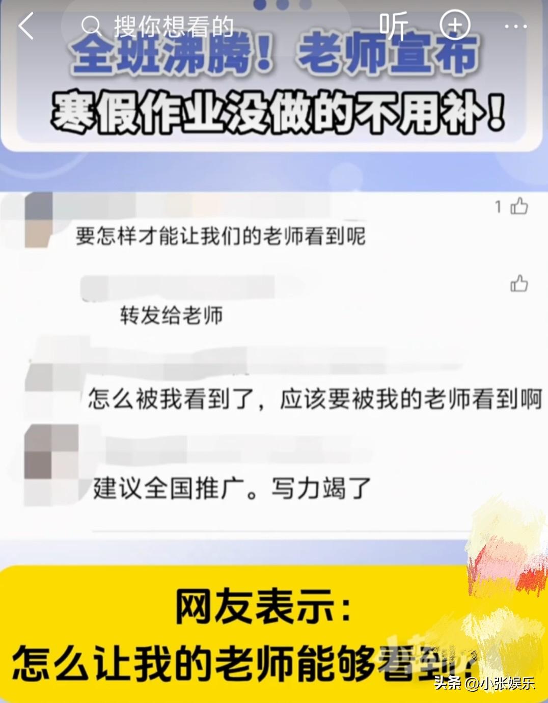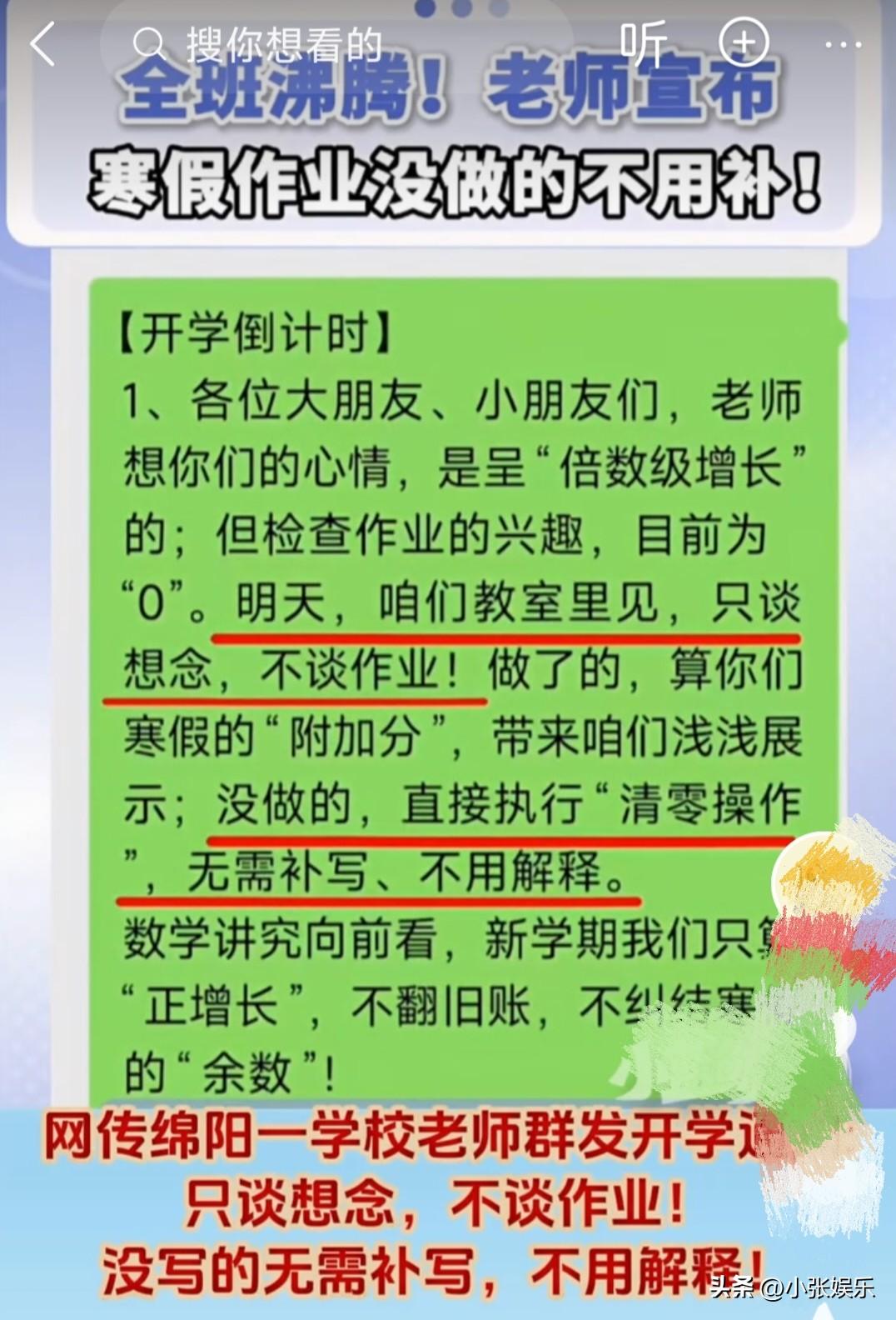 一夜之间全网沸腾!老师宣布:寒假作业没写完,不用补了!我实名羡慕! 开学前的深夜,多少孩子在一支灯、一支笔、一个夜晚疯狂赶工?多少家长陪着熬到崩溃?就在无数家庭被作业逼得喘不过气时,一则通知直接炸翻全网。 最近开学季,多地学校、老师接连发布暖心公告:寒假作业没写完的,不用补了!开学第一周,不检查、不批评、不惩罚! 重庆教委更是正式发文:全市中小学开学第一周不强制检查作业、不组织摸底考试,瞬间让无数学生和家长松了一大口气。 开学前几天,几乎全国家庭都在上演同一幕: 孩子揉着通红的眼睛,作业本写得歪歪扭扭 家长又急又心疼,一边催一边帮着抄抄写写 有人熬夜到凌晨两三点,只为应付开学检查 很多孩子边写边哭,不是不想写,是真的写不完;不是不努力,是被焦虑压得抬不起头。 就在这时,老师在班级群里的一句话,直接让全班破防: “作业没写完没关系,不用补了,我们只谈想念,不谈作业。” 没有指责,没有施压,没有当众点名,只有一句“先调整好状态,安心上课”。 不少孩子当场愣住,随后忍不住笑出来,压在心头的大石头,终于落地了。 官方与学校态度:不检查≠不负责,不惩罚≠纵容 重庆教委明确: 1. 开学第一周不强制检查作业 2. 不违规组织开学摸底考试 3. 目的是减轻学生焦虑,让孩子平稳收心 多地校长、老师也公开表态: 临时赶出来的作业,只有应付,没有效果; 逼着孩子熬夜完成,只会毁掉学习兴趣; 比起一本写满的练习册,身心健康、阳光心态更重要。 这不是放任不管,而是把教育从“赶任务”拉回“养习惯”的正轨。 未完成的作业,可以后续慢慢补、分层完成,绝不以惩罚和施压的方式对待孩子。 网友吵翻:有人欢呼,有人担忧 支持派: 终于有人懂孩子了!建议全国推广 不检查作业,亲子关系都变好了 教育该有温度,而不是只有压力 质疑派: 不检查作业,孩子更不想写了, 中考高考不心软,现在放松以后吃亏,这是对孩子不负责任 不补作业,不是不学习;不检查,不是不要求。 真正的教育,是唤醒自觉,不是强迫完成。 这波“作业免补”刷屏,本质上是一场教育的温柔觉醒。 作业的初衷是巩固知识,不是制造焦虑;开学的意义是迎接新知,不是制造恐惧。 好的教育,从来不是逼孩子熬夜赶工, 而是让他们带着轻松的心情,愿意走进课堂; 不是用惩罚制造恐惧, 而是用理解唤醒自律。 宽容不是纵容,放松不是放纵。 老师少一点苛刻,孩子多一点底气; 家长少一点焦虑,家庭多一点温暖。 你支持开学不检查作业吗? 你家孩子,开学前也在疯狂补作业吗? 评论区聊聊你的看法。