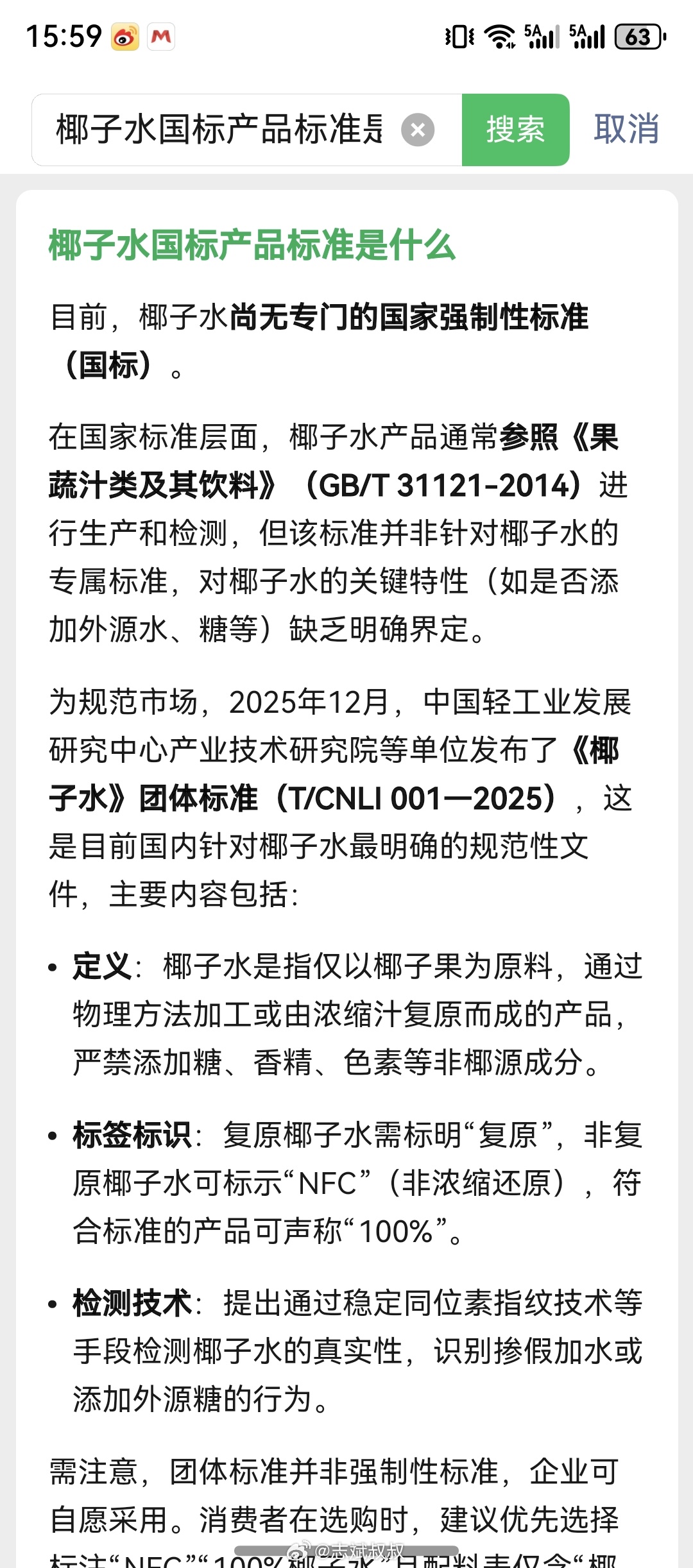 但这个标准并非针对椰子水的专属标准,对椰子水的关键特性(如是否添加外源水、糖等)缺乏明确界定。