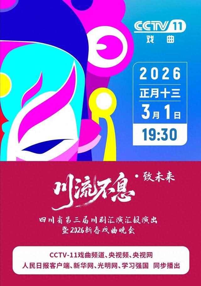 3月1日19:30,“川流不息·致未来”——2026新春戏曲晚会,将在CCTV-11戏曲频道、央视频、央视网,以及人民日报客户端、新华网、光明网等平台同步播出。本场晚会作为四川省第三届川剧汇演汇报演出,深度融合四十年来川剧艺术传承精华,巧妙融合前沿舞台科技与青春创意表达,为全国观众精心呈现一场守正创新、韵味悠长的川剧视听盛宴。
