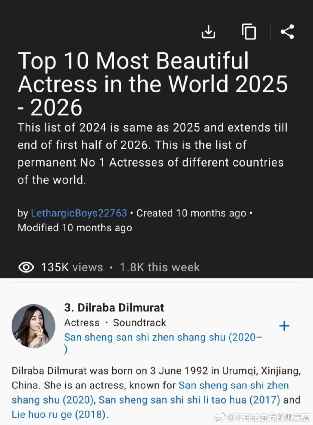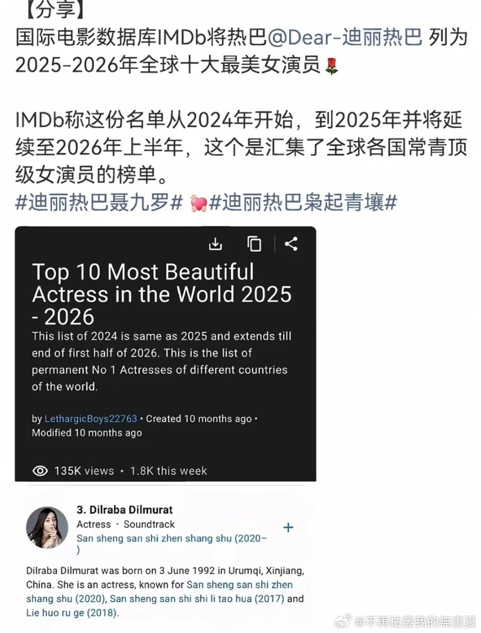 我早就说了迪丽热巴是地球球花吧全球十大最美女演员 入围的中国人仅且仅有迪丽热巴一