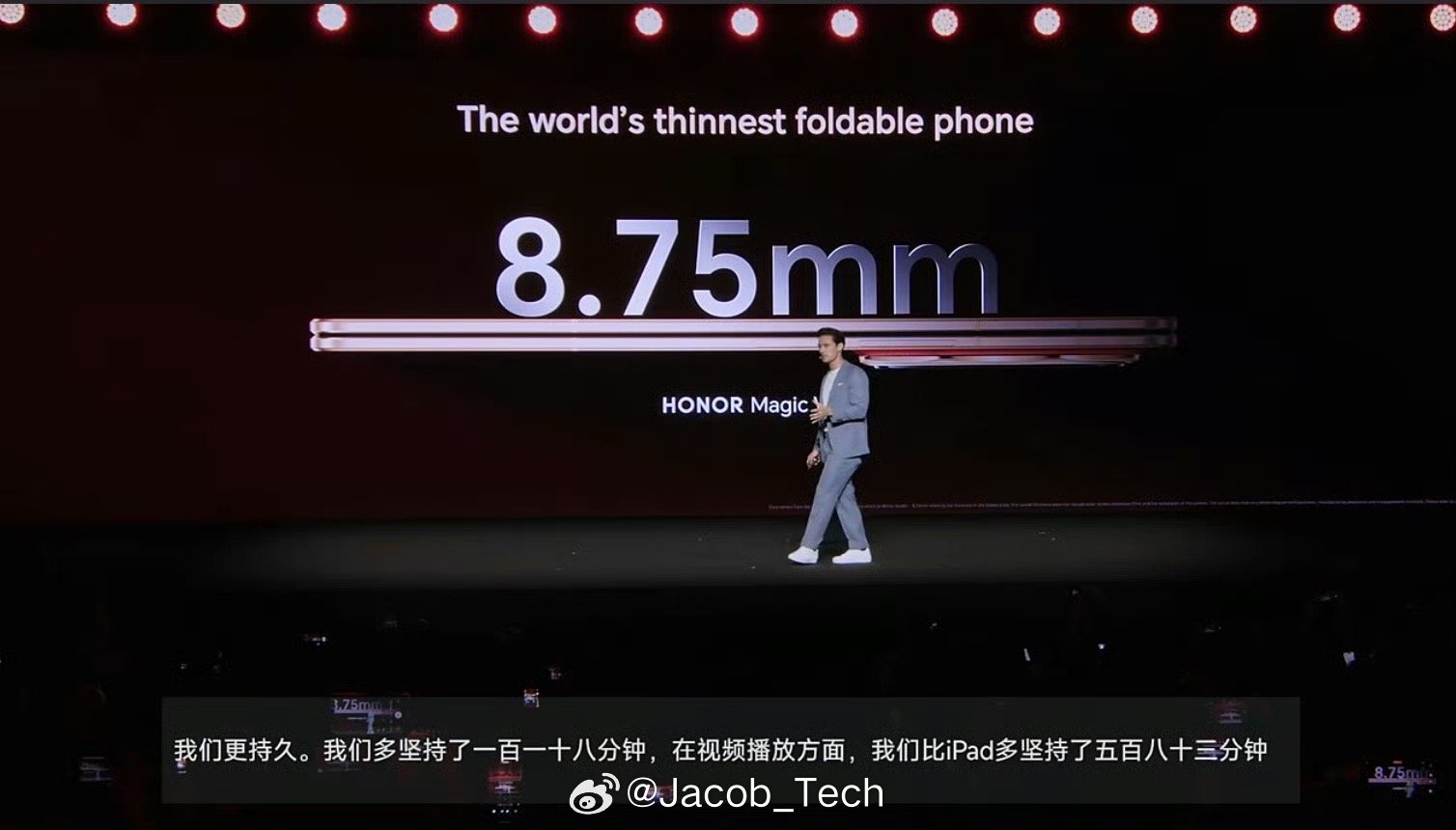 荣耀MagicV6折叠屏轻薄纪录保持者3月1日巴塞罗那MWC展会之上,荣耀Magic V6迎来全球发布,这款折叠屏旗舰以满格惊喜刷新行业认知!8.75mm的折叠厚度不仅创下折叠屏轻薄新纪录,更比同期直板旗舰更纤薄,彻底打破“折叠屏必然厚重”的刻板印象。这一极致轻薄的背后,是荣耀硬核技术的全面加持,第四代青海湖硅碳电池实现空间与能效的最优解,升级后的盾构钢铰链以军工级材质压缩机身空间,每一毫米的突破都是技术深耕的见证。