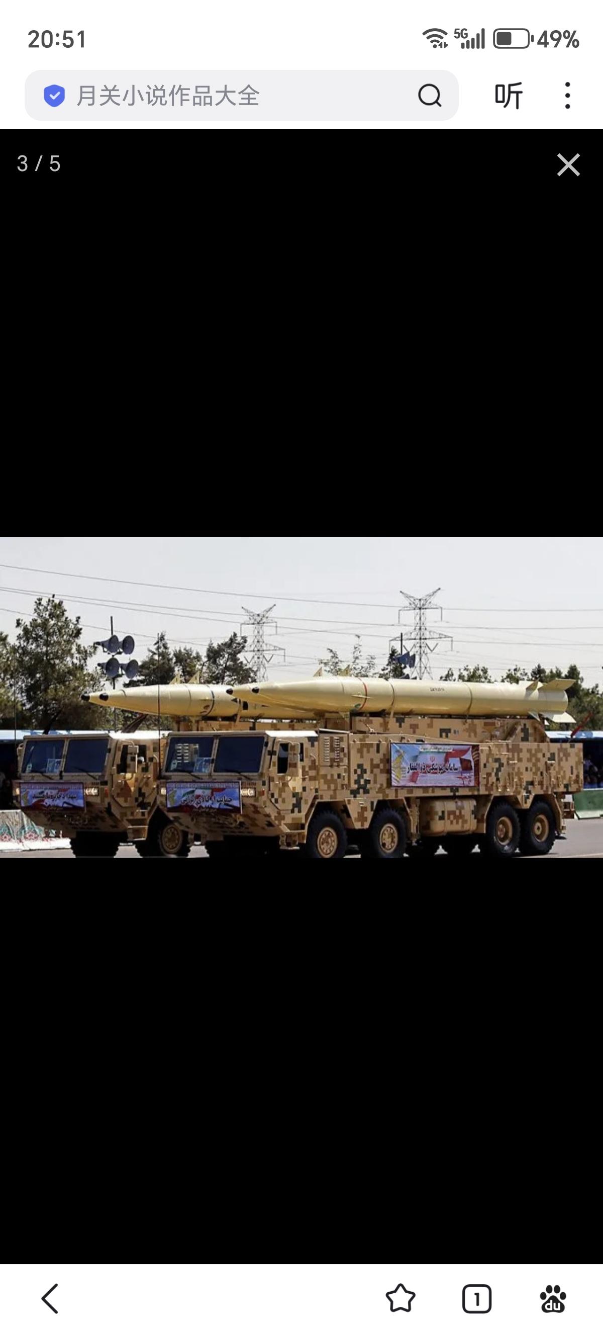 美国这回逮到了伊朗的固体燃料导弹发射车Zolfaghar弹道导弹,带有可分离弹头,猜测其弹体长10.3米,直径0.68米,总重4615千克,其中战斗部重579千克,射程700千米,采用惯性/卫星导航系统,其改进型Zolfaghar Basir反舰弹道导弹还增加了光电末制导,末端速度5马赫,圆概率误差约为10米。采用8X8底盘承载两枚导弹倾斜发射。