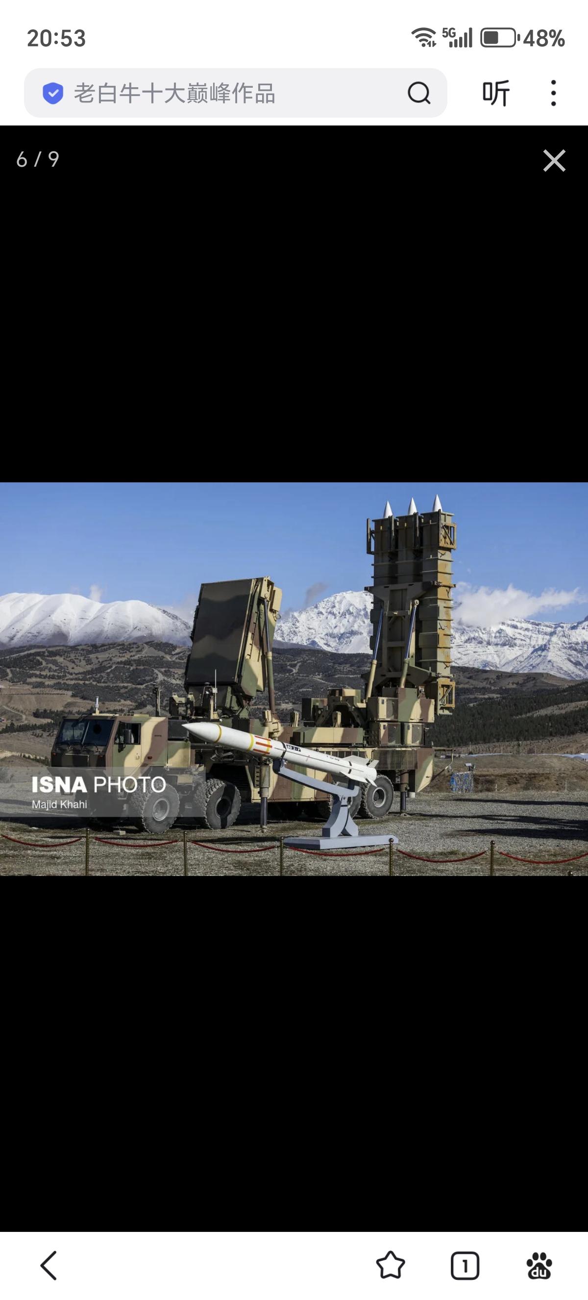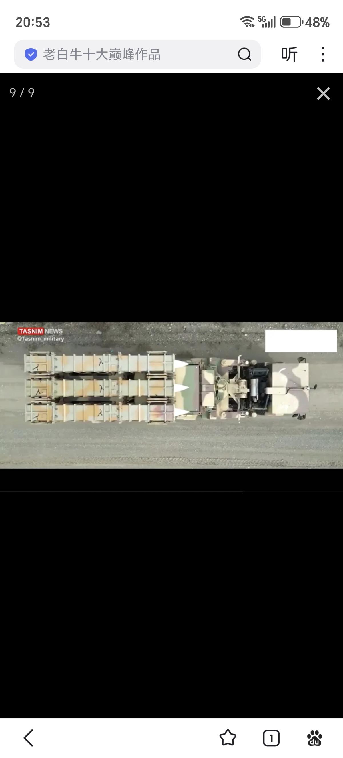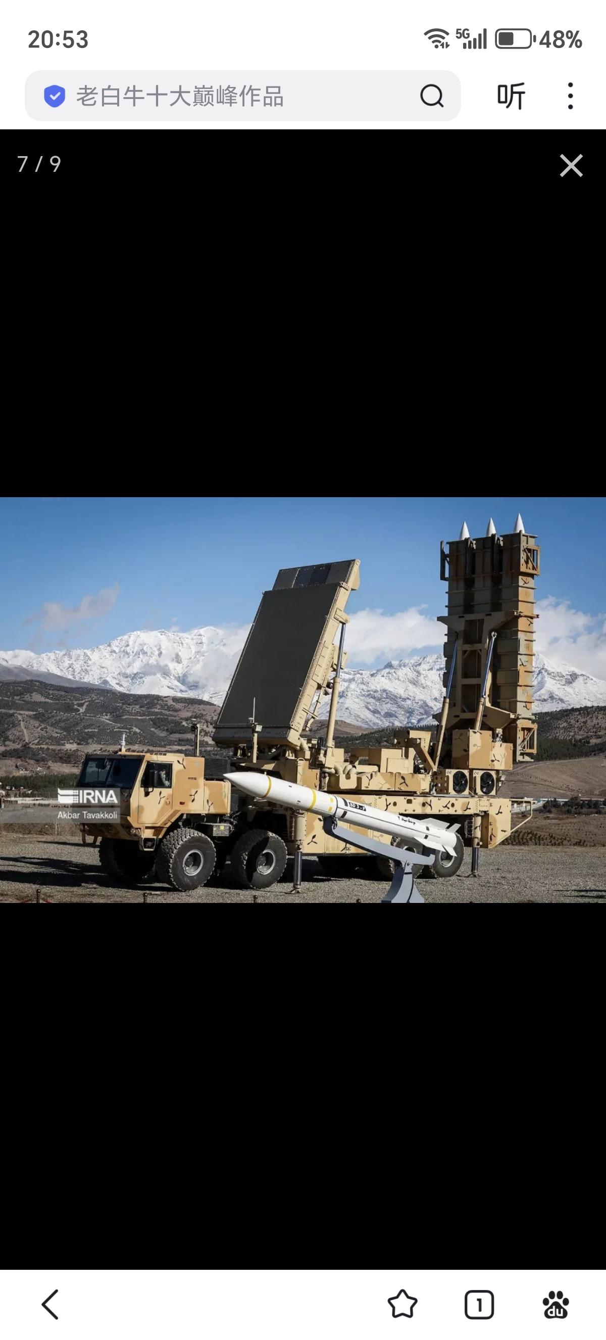 美军发布的打击视频中还打到了一辆稀罕货,就是伊朗的愿望(Arman)/战术猎人防空导弹系统。愿望远程防空导弹系统采用的是伊朗国产的Zafar型8X8卡车,该车空重约21吨,有效载荷约24吨,长度约12米,宽度约2.7米,高度约3米,安装了约400马力柴油机,最大公路速度约90千米/时,续航里程约800千米,坡度60%,边坡30%,可跨越约0.6米垂直台阶或2米壕沟,涉水深1.2米,主要是更换了车头,增加了外伸式的液压支撑。 愿望远程防空导弹系统配备有集成雷达和导弹的转塔,可360度旋转,能够同时探测180千米范围内24个目标,同时攻击120千米半径内的6至12个目标。该系统有两种配置,一种是厚重的Najm型S波段无源相控阵雷达,另一种则是较薄的Joshan型X波段有源相控阵雷达。Najm-804型无源相控阵雷达于2019年春季亮相,天线增益36分贝,最大发射功率6.4千瓦,方位角波束角2.7度,波束俯仰角3.2度,目标探测距离达到200千米,可在150千米外探测2.4平方米截面的战斗机和攻击无人机等目标,探测概率为0.8,虚警概率为10-6,最多可同时跟踪100个目标。在制导导弹时雷达转向目标方向,可以同时制导6枚导弹探测、拦截6个目标,还可以探测85千米外的隐身目标,并在45千米内将其摧毁。Joshan型有源相控阵雷达还没有性能披露。似乎这两种雷达分别配属伊朗军队和革命卫队。 愿望远程防空导弹系统可以发射猎人-3F防空导弹,这是猎人-3导弹的改进型。猎人-3战斗部90千克,射程120千米、最大射高27千米。采用尖卵形头锥+带有两侧贯穿至弹底导线肋条的圆柱形弹体+弹尾4片X型布局梯形小展弦比边条翼+梯形全动尾舵的气动布局,制导方式采用中段惯导+末段无线电指令/半主动雷达制导。有趣的是这种防空系统还能够发射猎人-3N防空导弹,其中部弹翼上移,可能更强调机动性。另外在宣传片中还出现了猎人-2防空导弹全重为1011千克,战斗部90千克,最大射程75千米,最大射高27千米,最大速度为4马赫。采用尖卵形头锥+圆柱形弹体+4片X型布局带前伸边条的梯形小展弦比边条翼+五边形全动尾舵的气动布局。这样一种系统就可以打两种不同射程导弹,可以视作是三月十五日防空系统的机动版本,伊朗人宣称3分钟能撤出阵地。重点突出自带雷达打了就跑提升生存性,但遇到美国和以色列这种级别的对手,空防被轻易突破,也只能被击毁了。