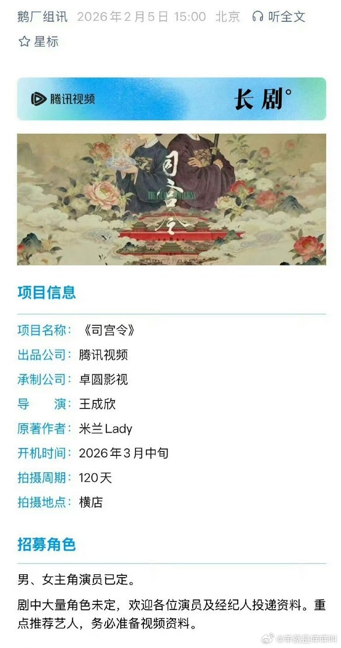 宋祖儿丁禹兮的 《司宫令》 3.16开机