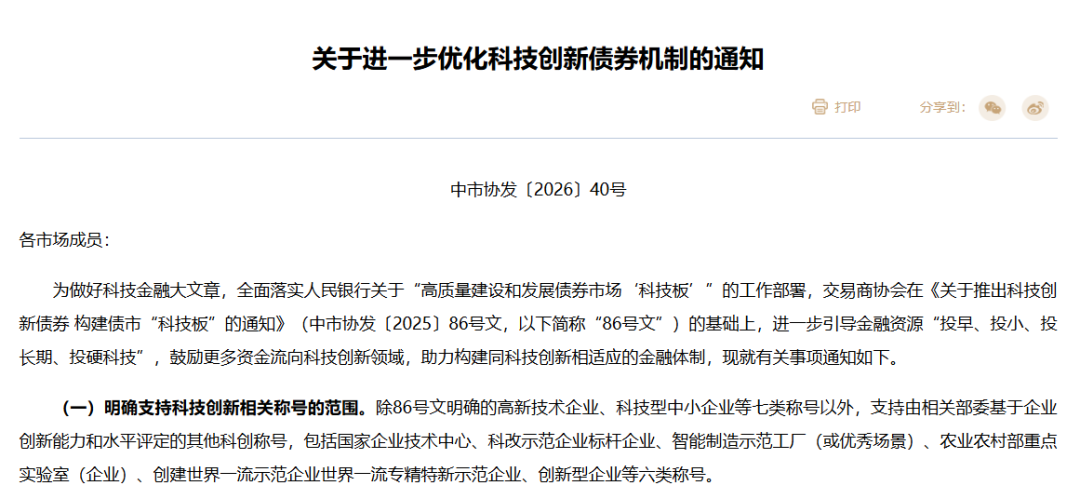 中国银行间市场交易商协会消息,为做好科技金融大文章,银行间市场于2025年5月7日推出科技创新债券,并取得阶段性成效。2026年3月2日,交易商协会发布关于进一步优化科技创新债券机制的通知。